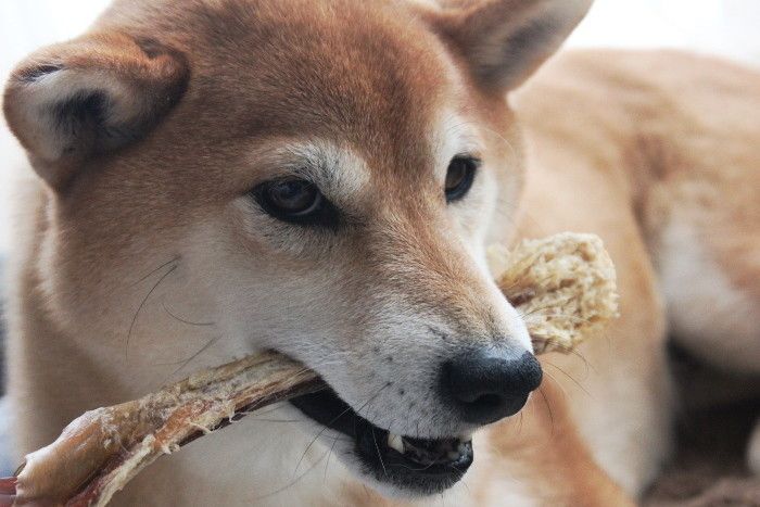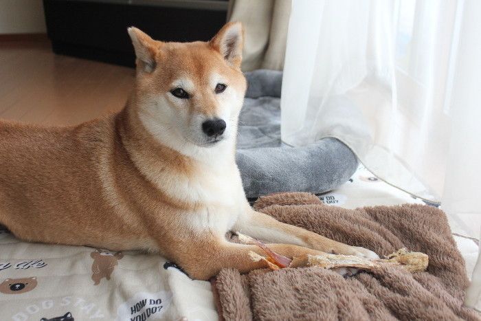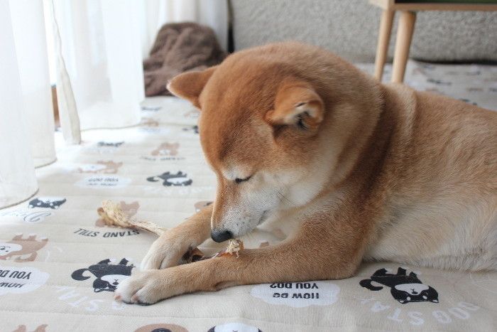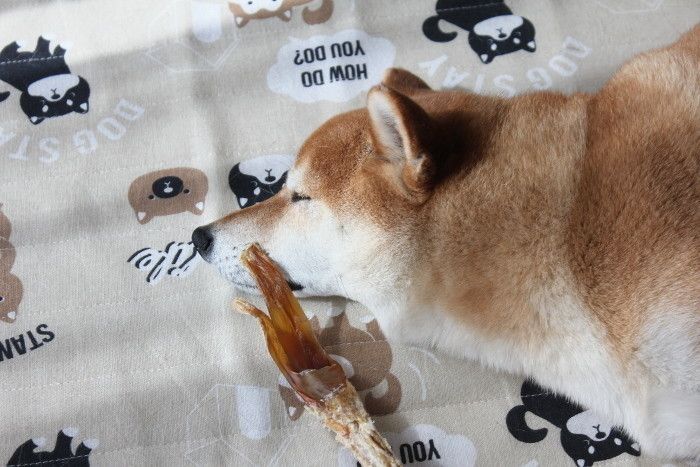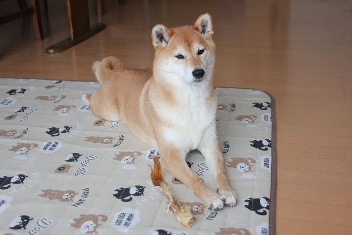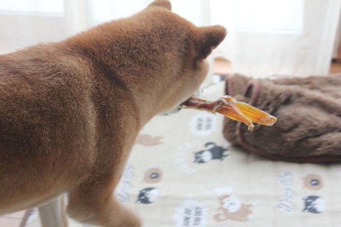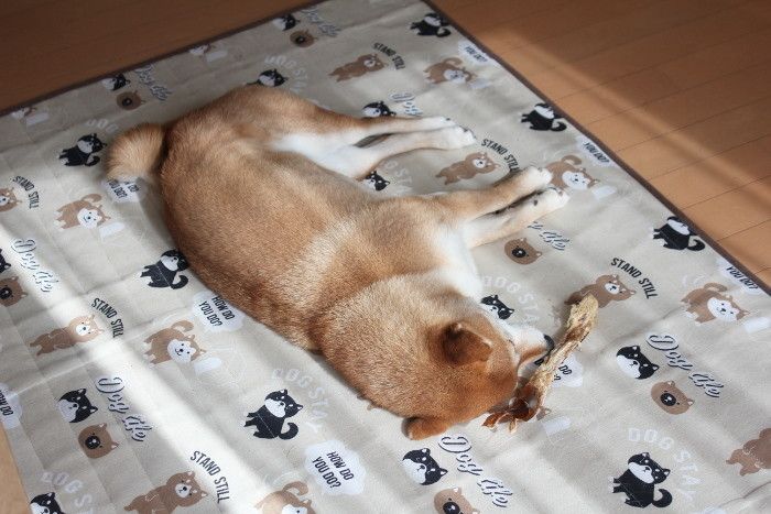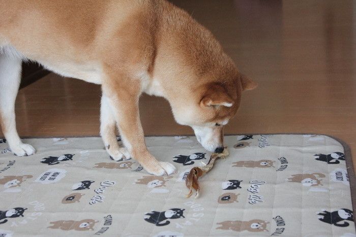 3分でギブアップして興味を無くしてしまいました。友人ちのわんこなら「は?どうしてそんな美味しいもの食べないの?」と言いそうです。ちなみに友人ちのわんこは黒ラブです。こんな大きなおやつでもカミカミできるのも納得です(笑)