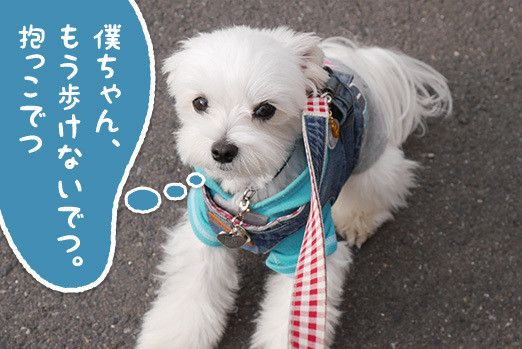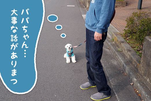 今日はパパちゃんといっしょにお散歩です。ふだんはしっかり歩くのに、甘えたくて仕方がないひろしは散歩中にピタっと止まります。