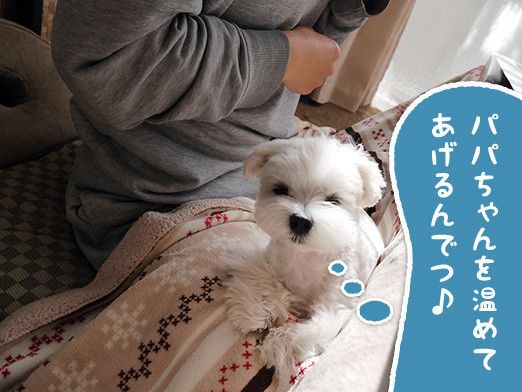 寒い朝はぬくぬくしたところが大好きなひろし。動きたくないはずなのに、パパちゃんが現れるとそんな素振りは見せません。寒がりなパパちゃんを自分が温めるんだと、勢いよく飛んできます。おヒザの上にいるときは、たくさん甘えられるから好きなのかも。寒さに弱いヘタレさと甘えん坊っぷりを発揮する冬のエピソードでした。
