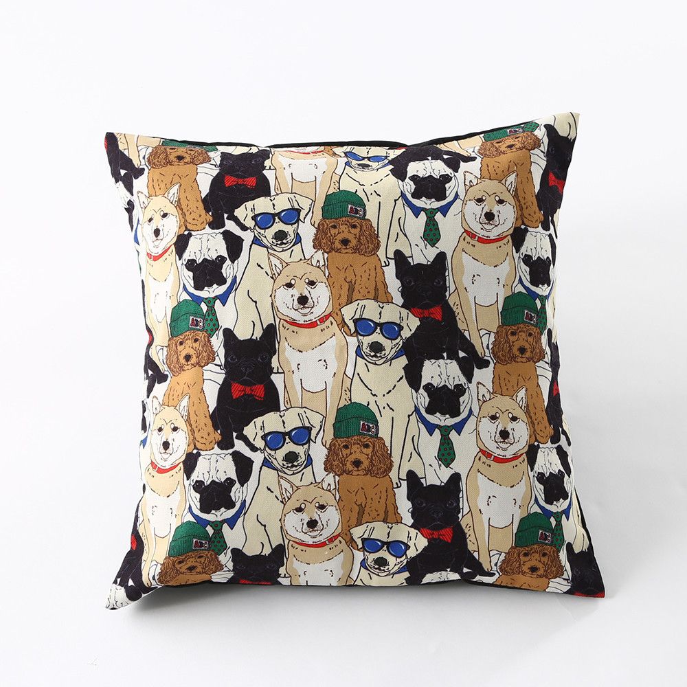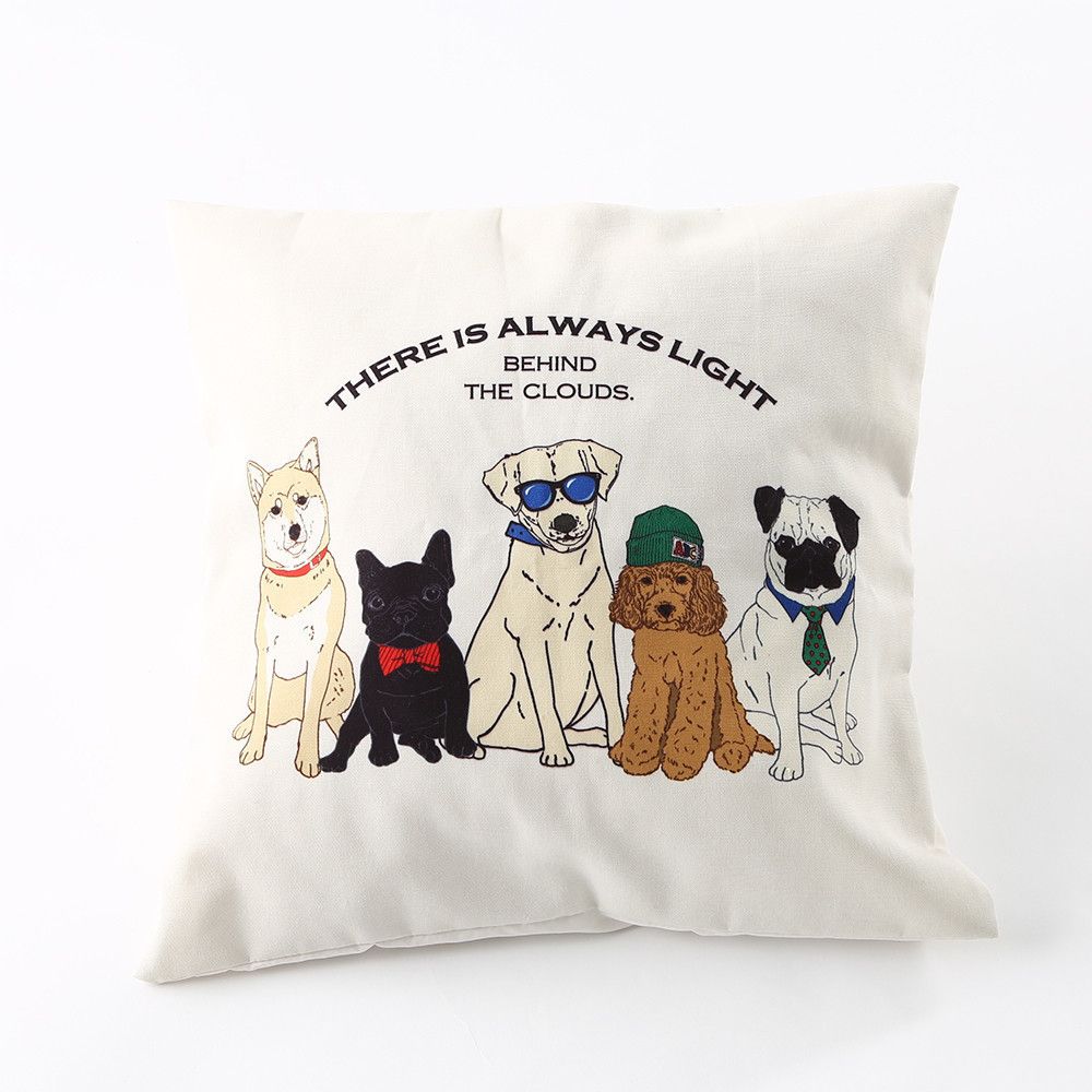 こちらはトイプードル、パグ、フレンチブルドッグ、柴犬、ラブラドールレトリバーの5犬種のイラストが総柄でデザインされた、なんとも豪華なクッションカバーです♪犬好きなら1度は飼ってみたいと思える犬種が勢ぞろい!サングラスをかけたラブラドールレトリバーがワイルドなのに対し、柴犬の凛々しい表情もたまりません♡