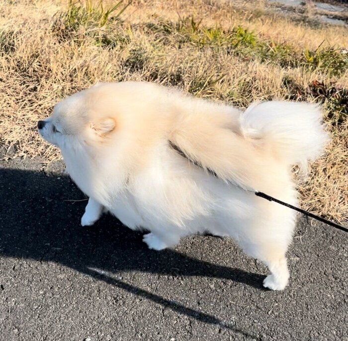 散歩待ちするポメラニアン!すまし顔で座る姿が「可愛くて、面白い」と話題!