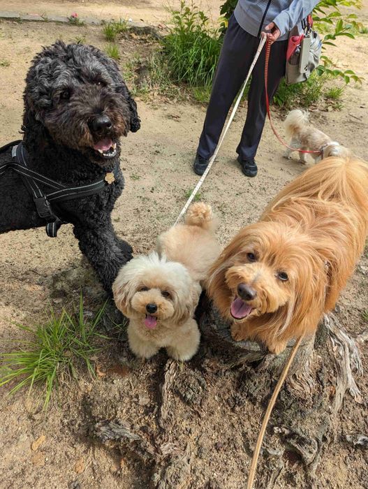 公園の中をいつものように歩いていたら、後ろから大型犬のお友達がそっと近づいてきました。