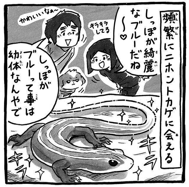 青い尻尾だと幼体で全身茶色だと大人なんやって