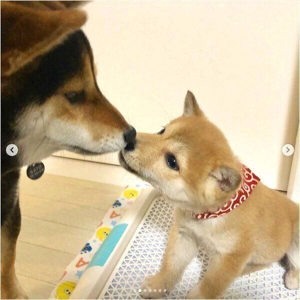 姉犬が「ノズル式の給水器」で水を飲むと→新入り犬も“まねっこ” お迎え当時のやりとりにほっこり!