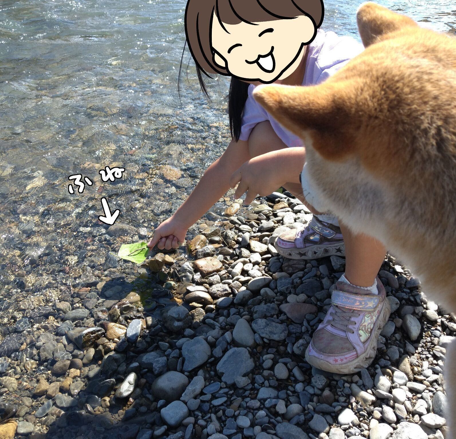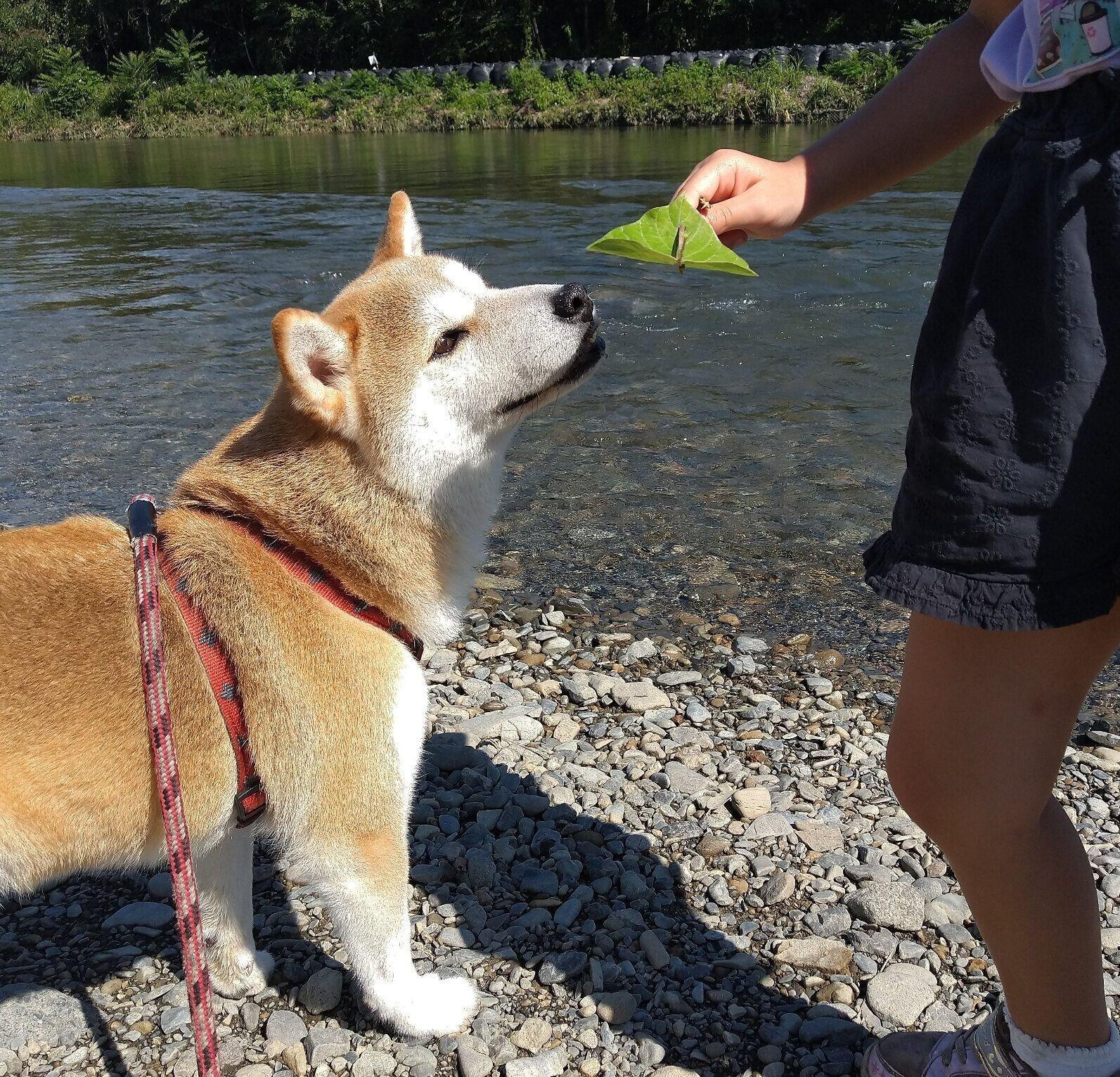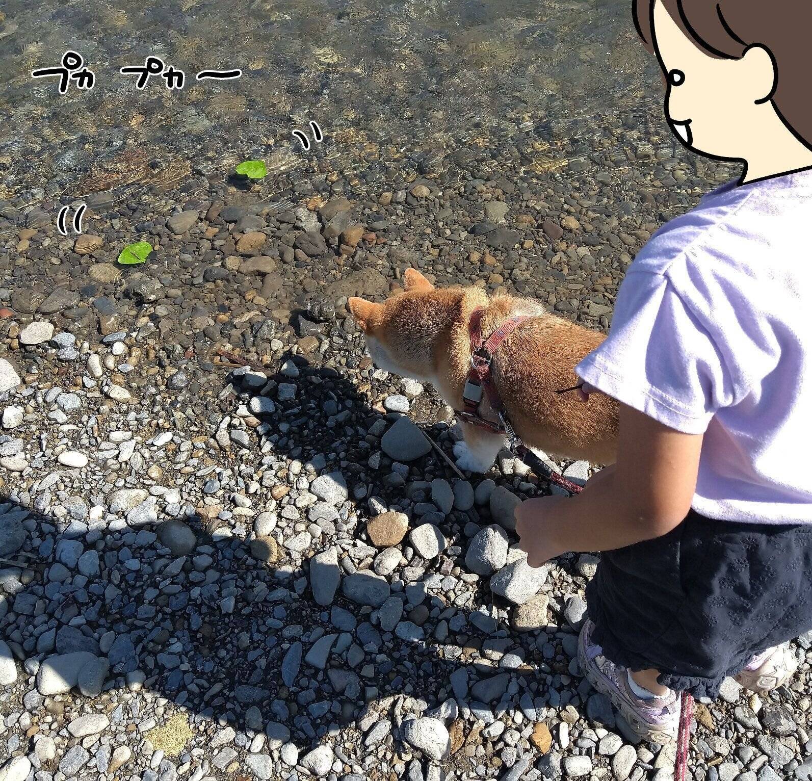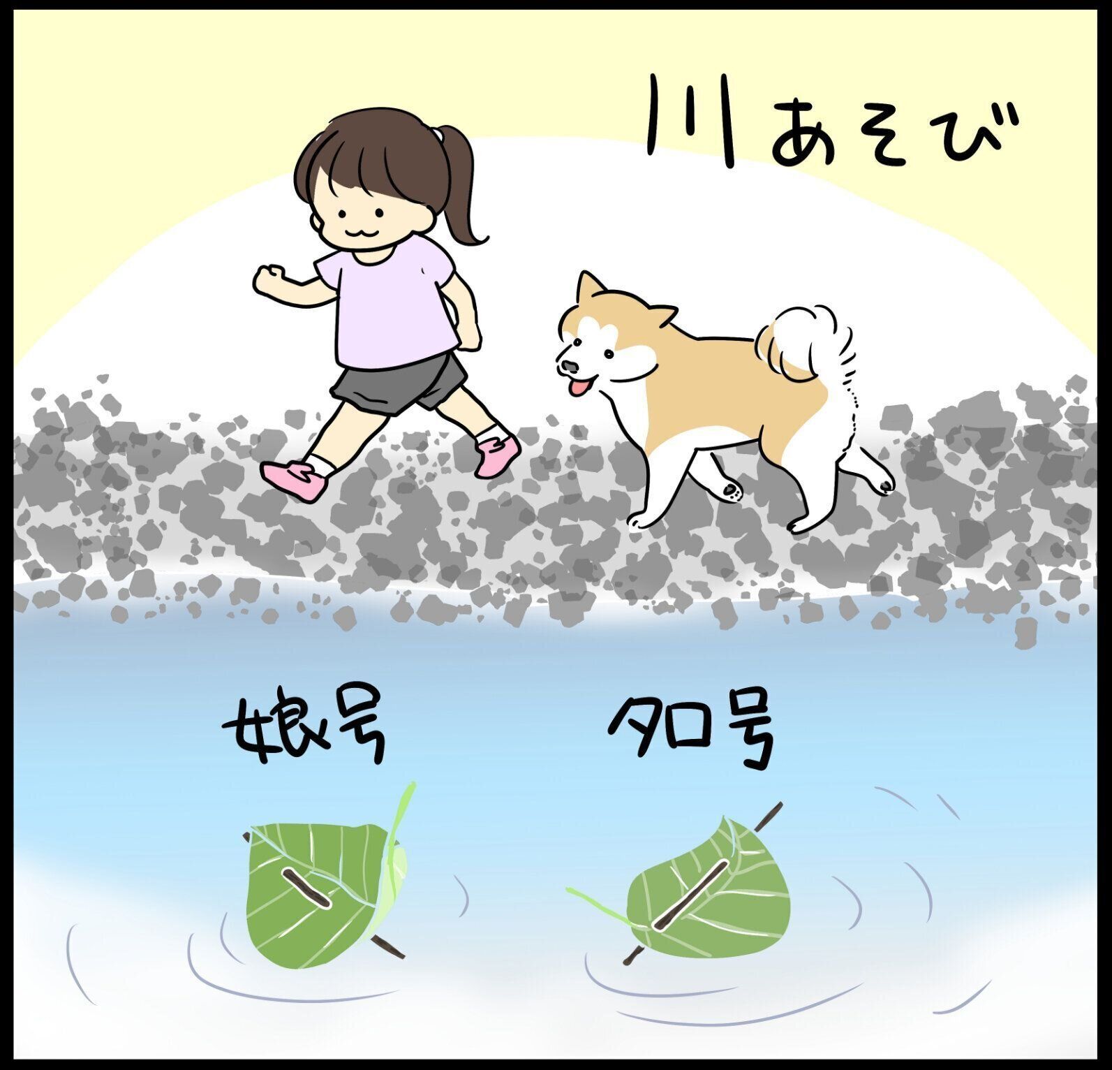 柴犬タロさんと娘葉っぱ船で競争してみた|連載「モフモフ柴とプニプニ娘」第235話