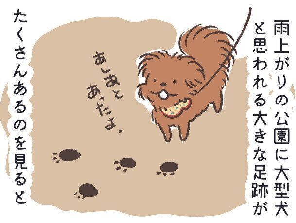 てんすけは知らない大型犬に吠えてしまうことがあるので、実際に公園で会ったら避けないといけないのですが、大きい足跡を見ると毎回ほのぼのします。