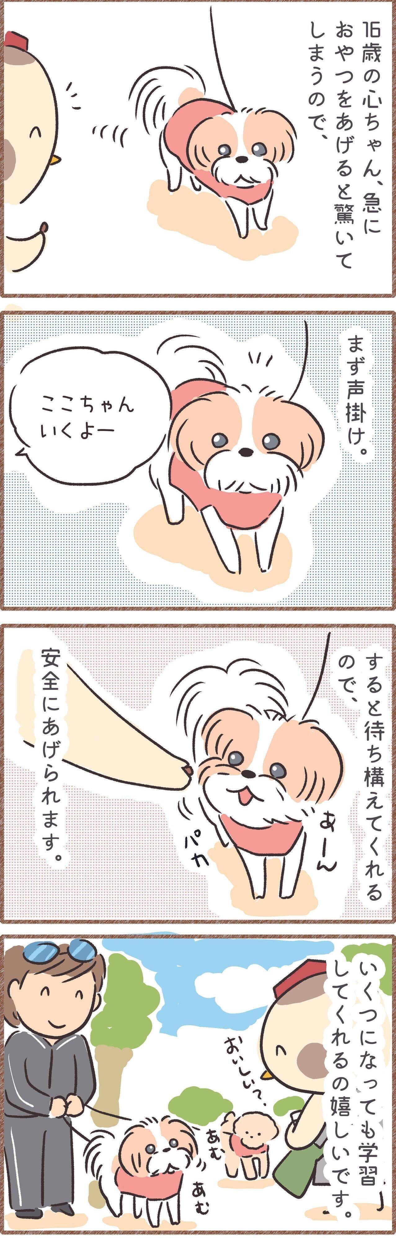 おやつをあげる前に声をかけてそっと口元に持っていくよう続けていたら、
