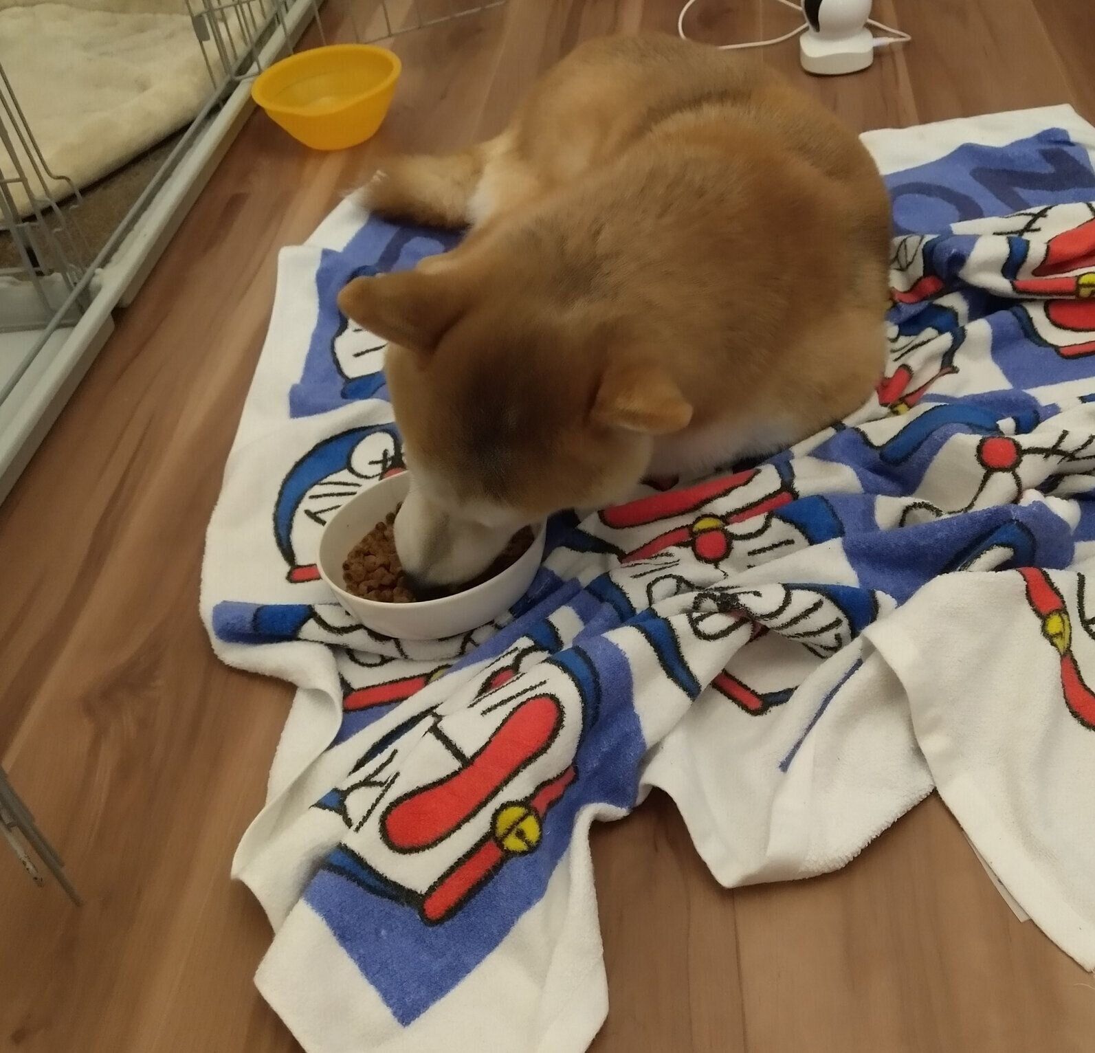 さすがにタオルの上は落ち着かないのでは…と思いながらもご飯をタオルの上であげてみました。