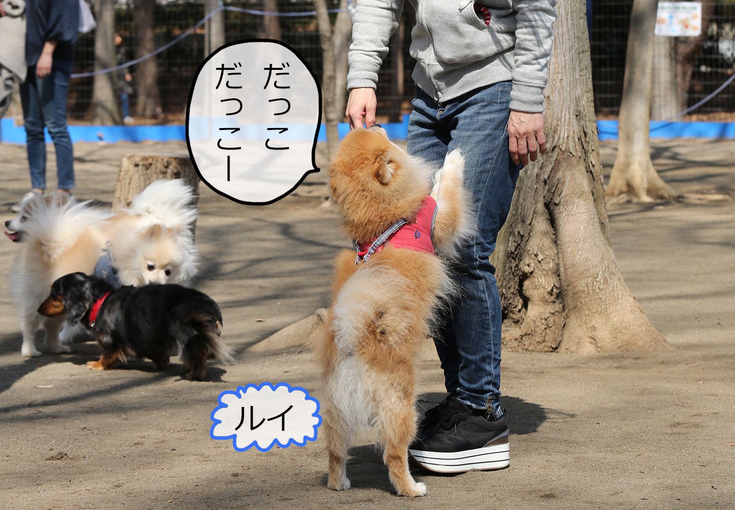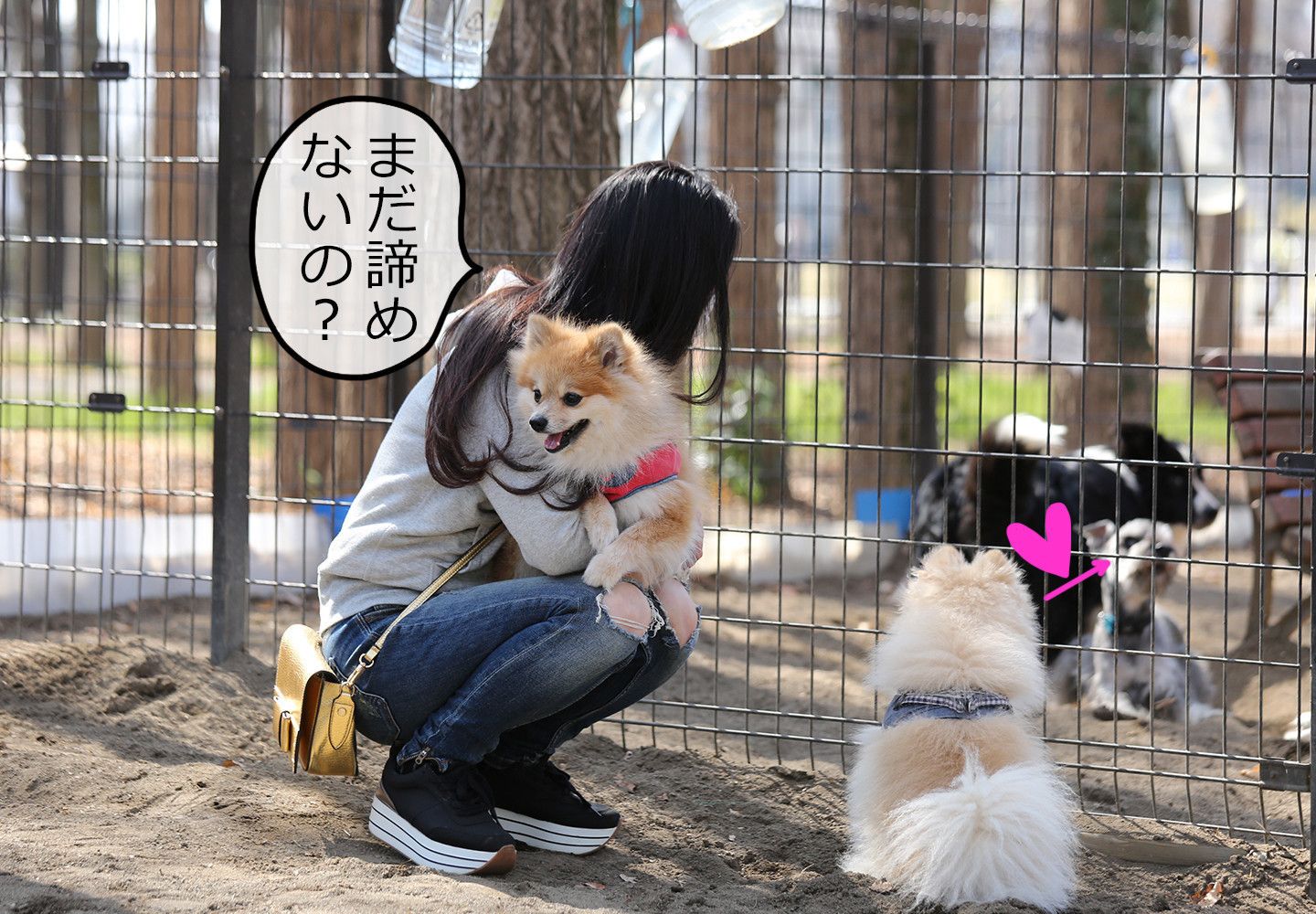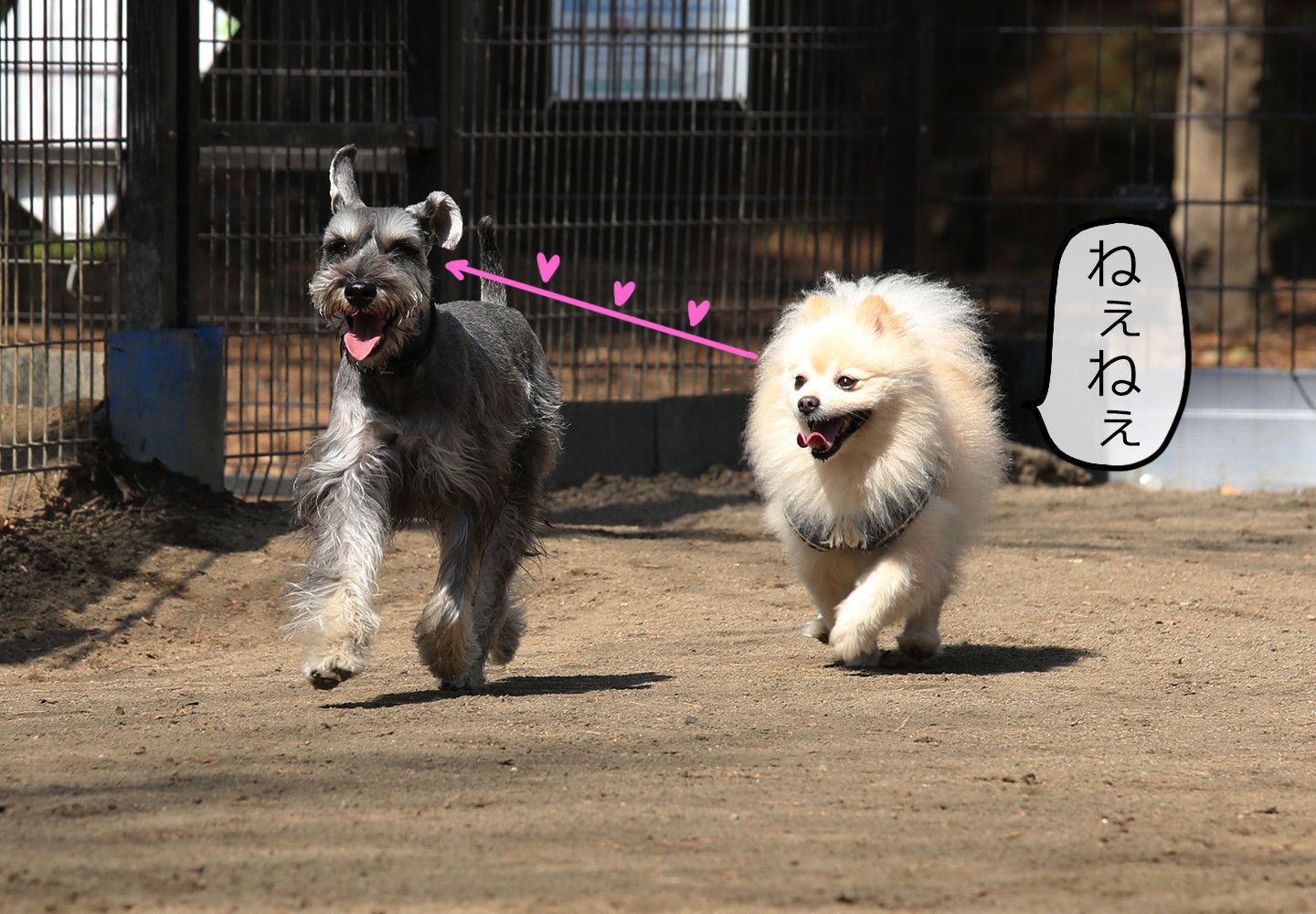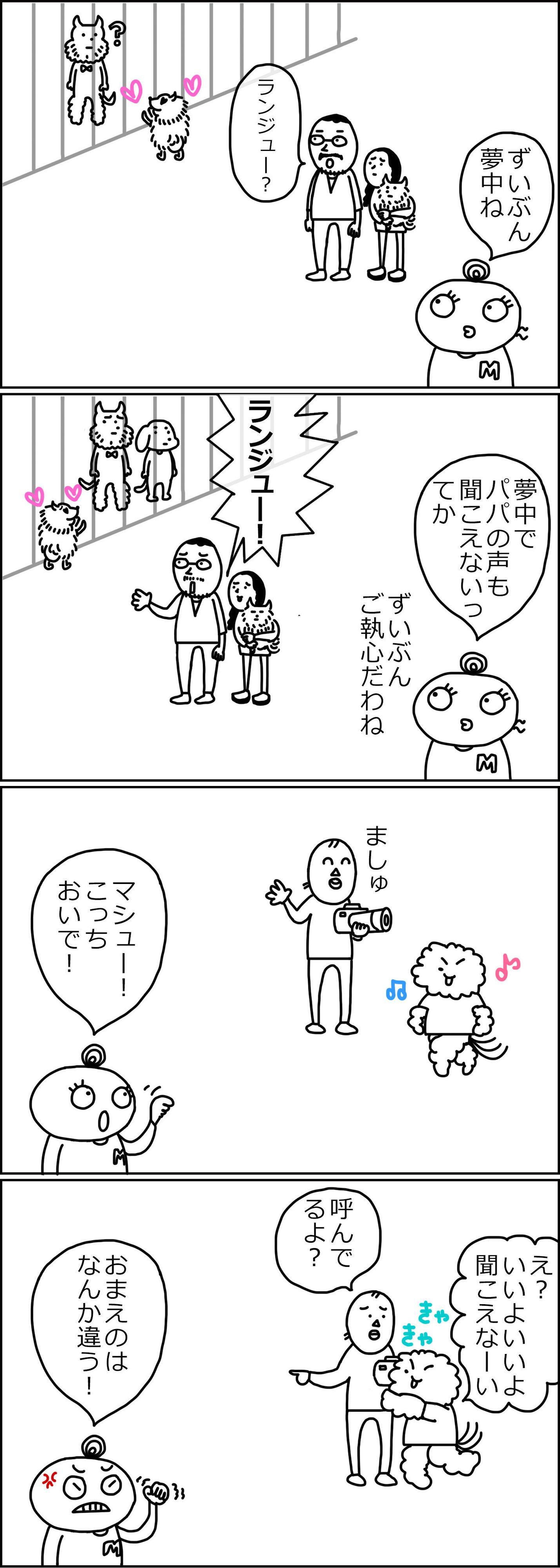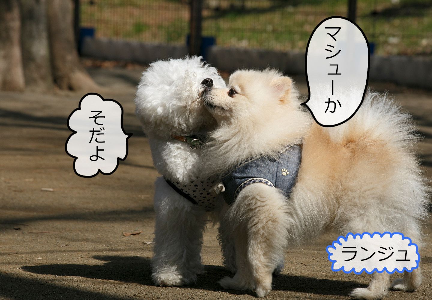 なのにあいさつもそこそこに、ランジュとマシューは別行動。マシューはヘラヘラドッグランじゅうをひとり走り回って、ランジュはミニシュナの男のコにロックオン。おい、久しぶりの再会に感動はないのかYO!