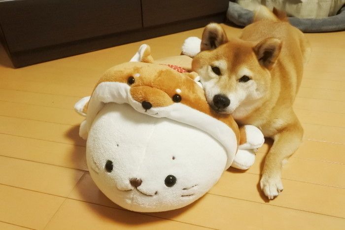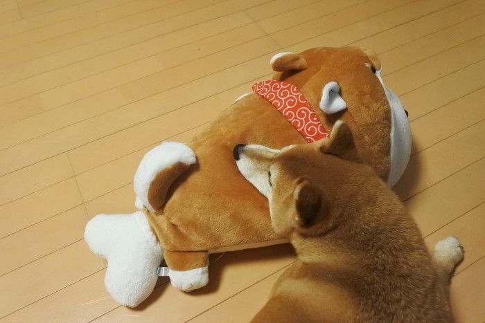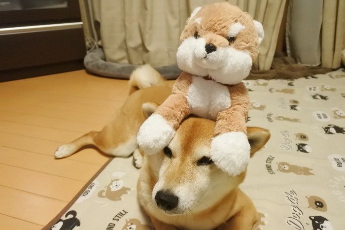 もちもちでふわふわなしろたん。マロたんもパピーの頃からしろたんのぬいぐるみで遊んでいます。しろたんの柴犬のかぶりものがあるなんて。可愛い。