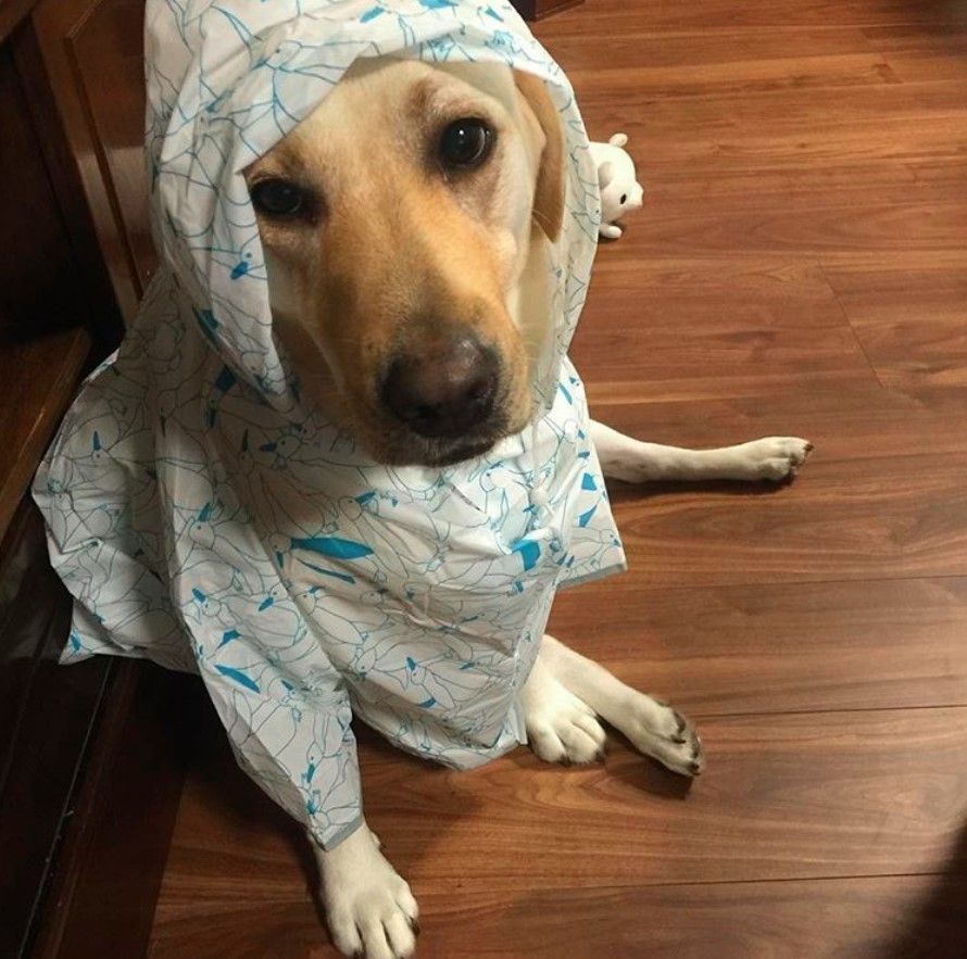 ラブラドールレトリバーのアロハちゃんは、3コインズ(300円ショップ)の人用レインコートを、ワンちゃん用にリメイクしてもらいました◎ワンちゃん用のレインコートも販売されていますが、意外とお値段が張るものも多いんですよね…。そう考えると300円でこんなに可愛く作れるなんて、かなりスゴイと思いませんか?これで雨の日のお散歩も安心ですね♪