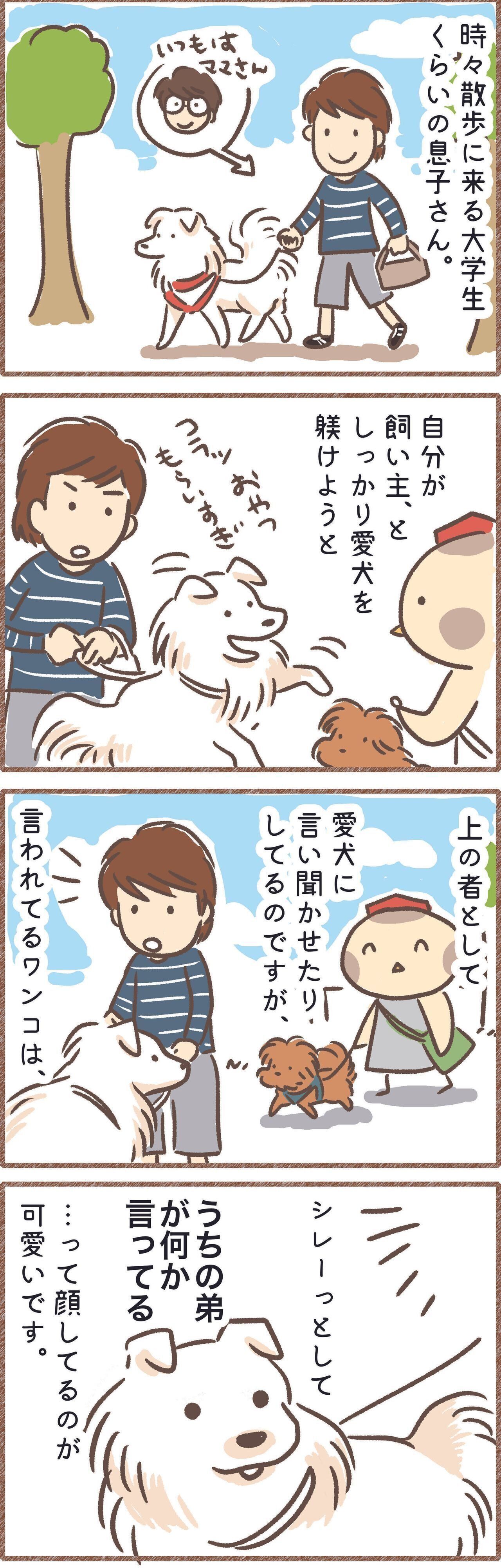 離れた場所で、飼い主さんがお説教するのですが、その話し方は「お兄ちゃんが妹に怒る」感じで微笑ましくもあります。