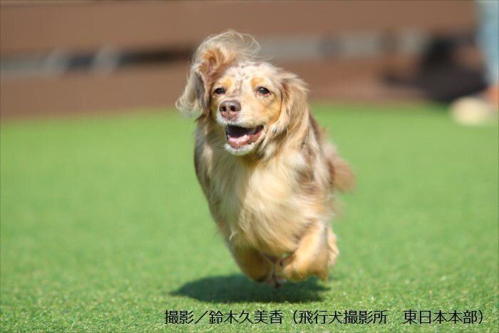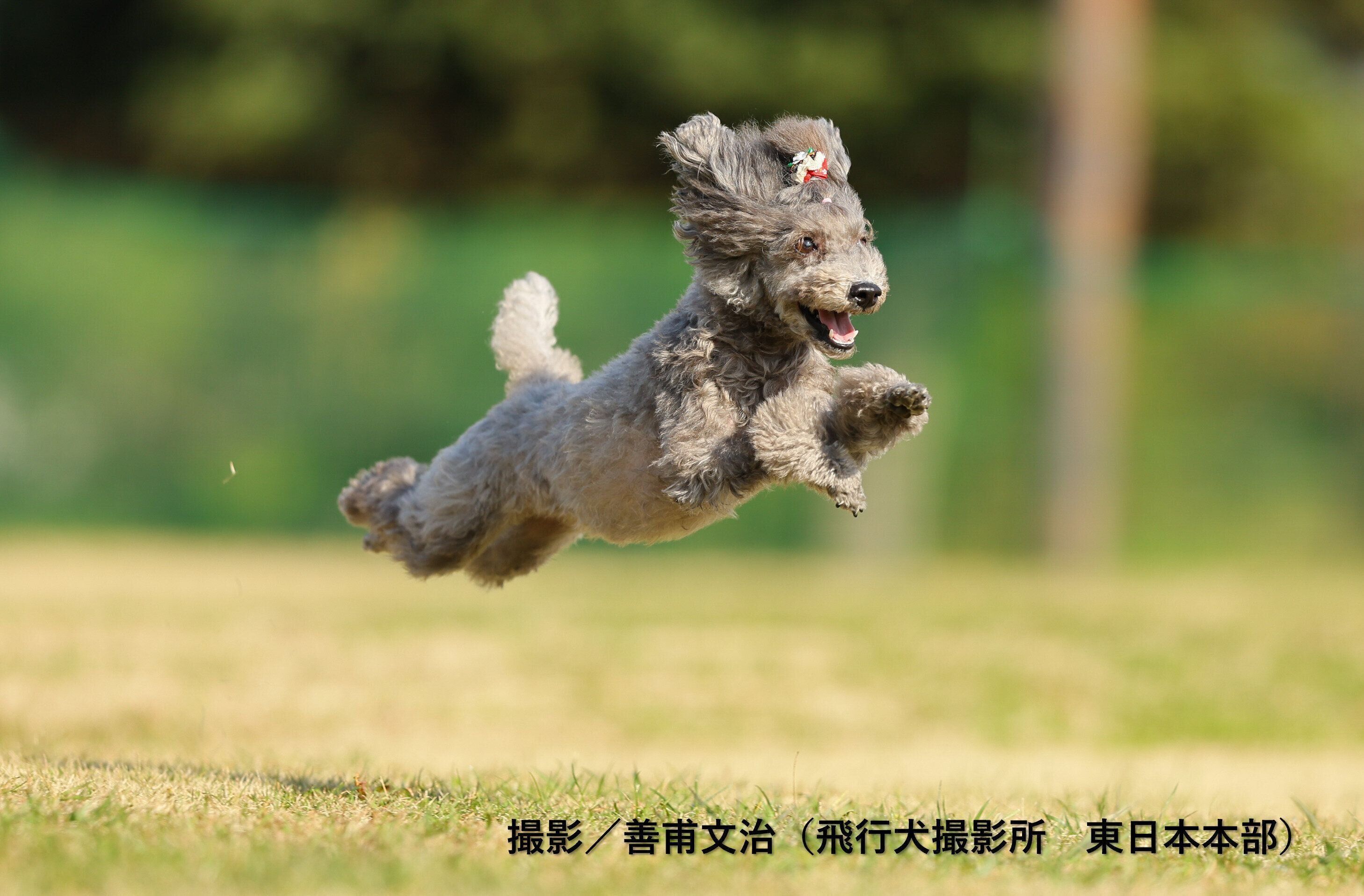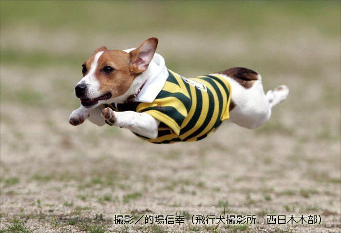 「飛行犬(そら飛ぶいぬ)」とは、ワンちゃんが全力疾走するさい、四本足全てが地面から離れ、宙に浮いて、あたかも空を飛んでいるように見える写真のこと。2005年に新しく作り出された言葉(造語)で2009年に商標登録されました。