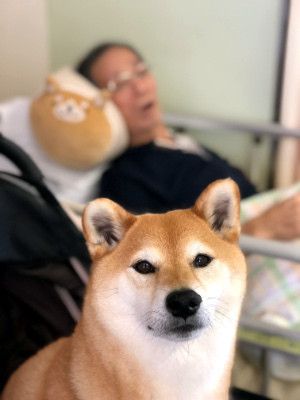 お言葉に甘え、カートでじぃじのベッドサイドまでマロたんと面会に行きました。マロたんも誇らしげな顔。