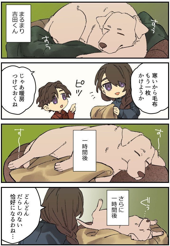 肌寒さを感じてか、丸くなって眠る吉田くんの寝姿をみて、暖かさをどんどん追加していく飼い主の二人。
