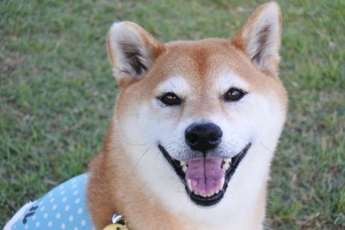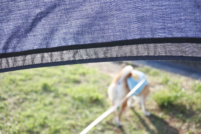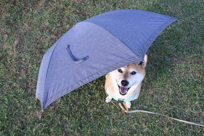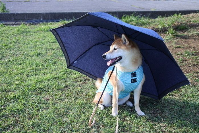 これで完璧。柴犬にしては大きなマロたんには少し小さいかも。ゴルフ用の日傘が必要かしら。