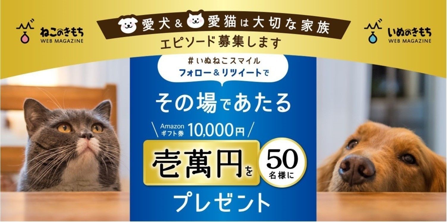 いぬねこのきもち公式アカウントをフォローして、該当の投稿をリツイートするとその場で50名様にAmazonギフト券10,000円分が当たっちゃいます!