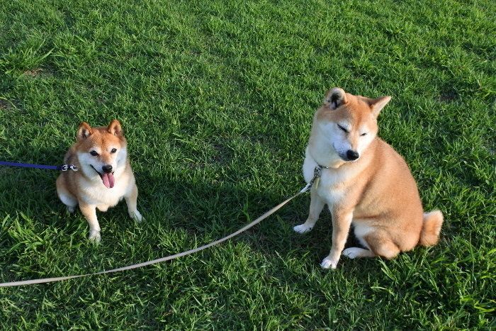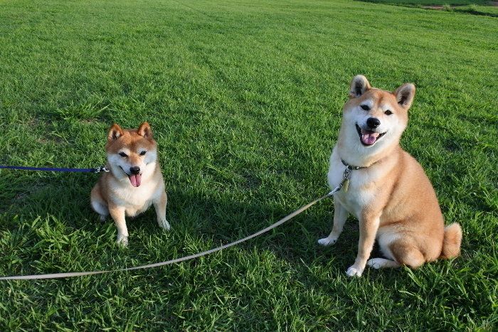 ヤマトくんだけじゃ大きさの違いがわからないと思いますが、豆柴のヤマトくんとマロたんが並ぶとこう。マロたんの大きさが一層際立ちます。