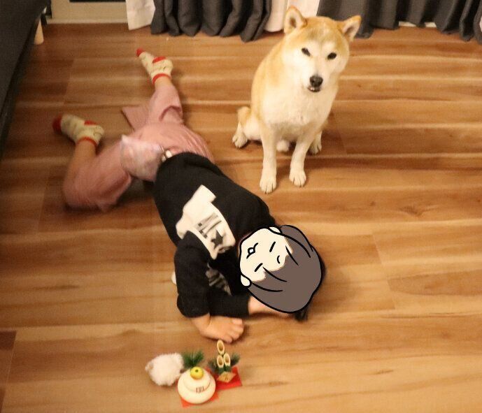 完全に飽きた娘と今頃お座りするタロさん