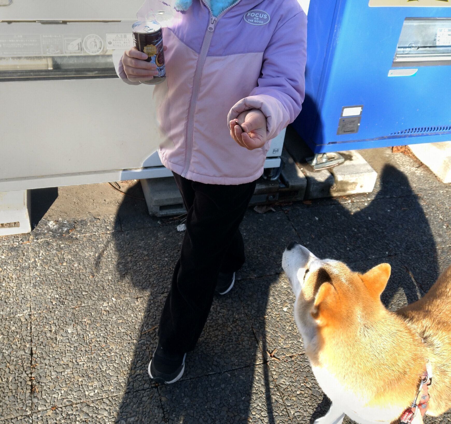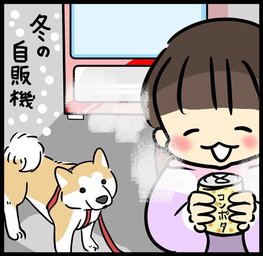 散歩の途中、身体が冷え込むと、近くの自販機で温かい飲み物を買い、寒い散歩を乗り切ります。