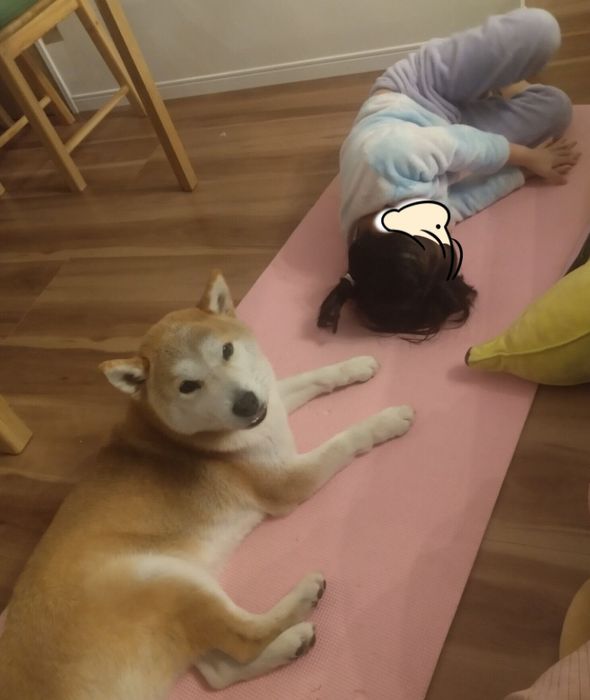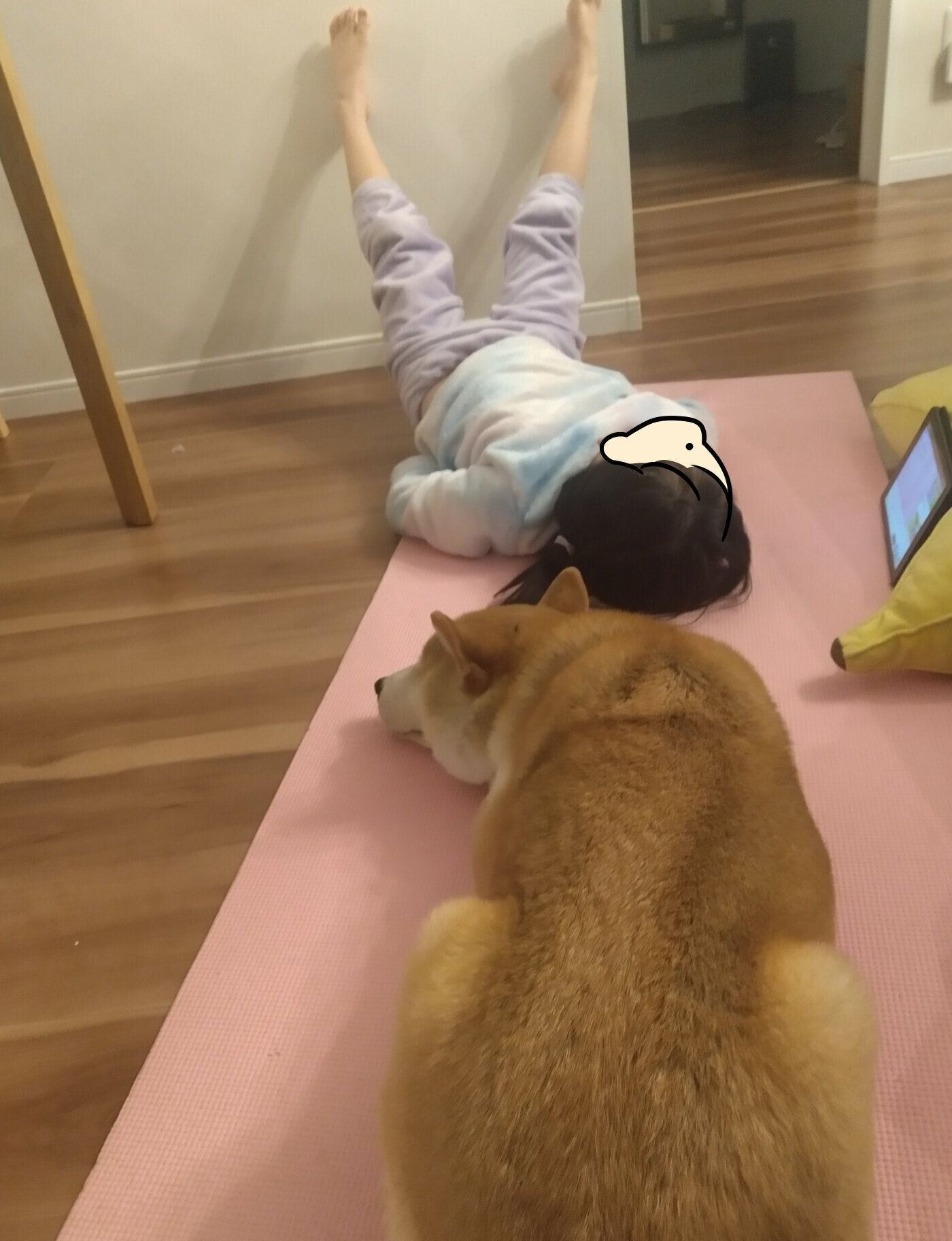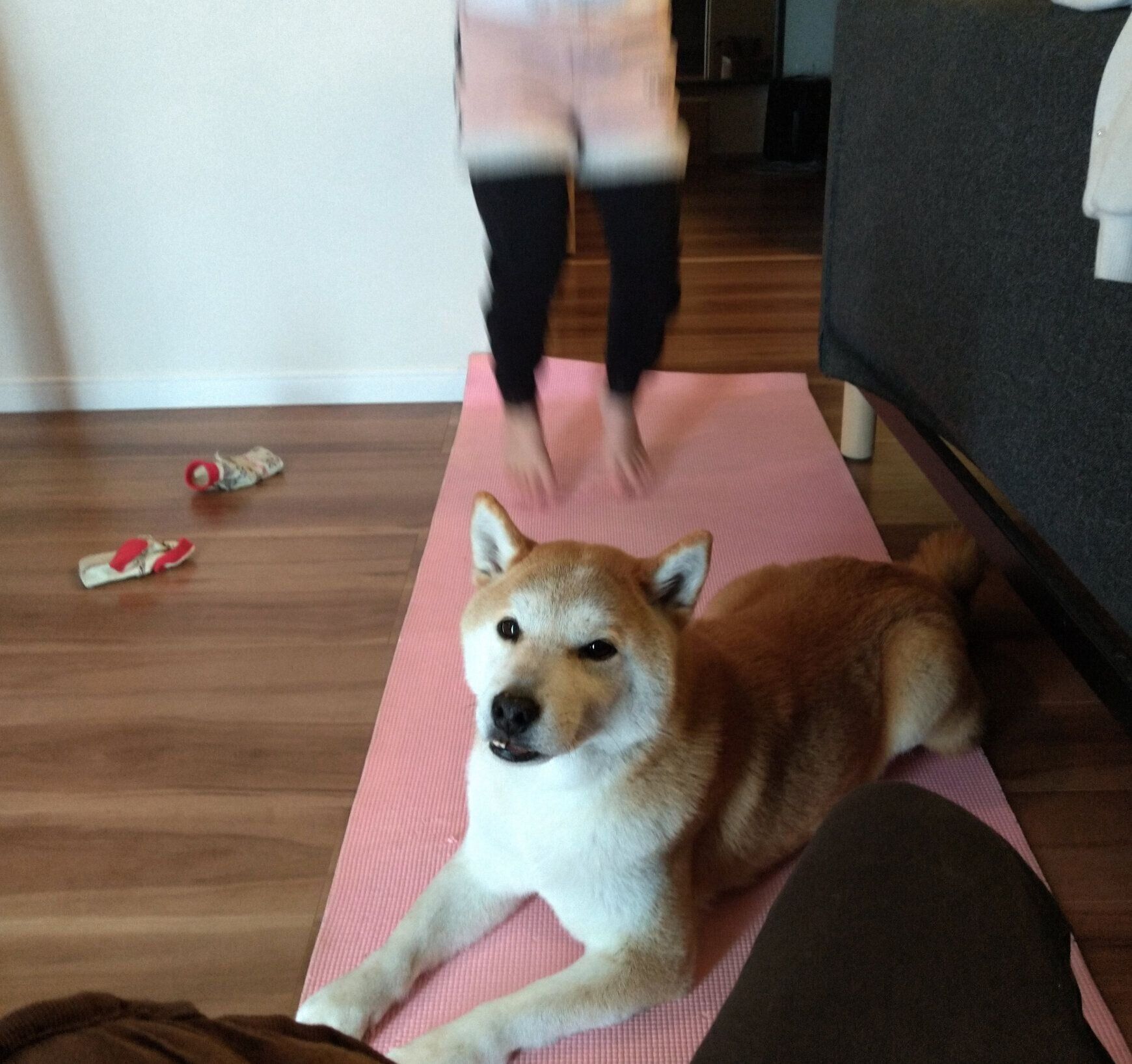 次の日の朝もマットに直行するタロさんと娘。昨日のことを忘れずにちゃんと半分づつマットを使っています。
