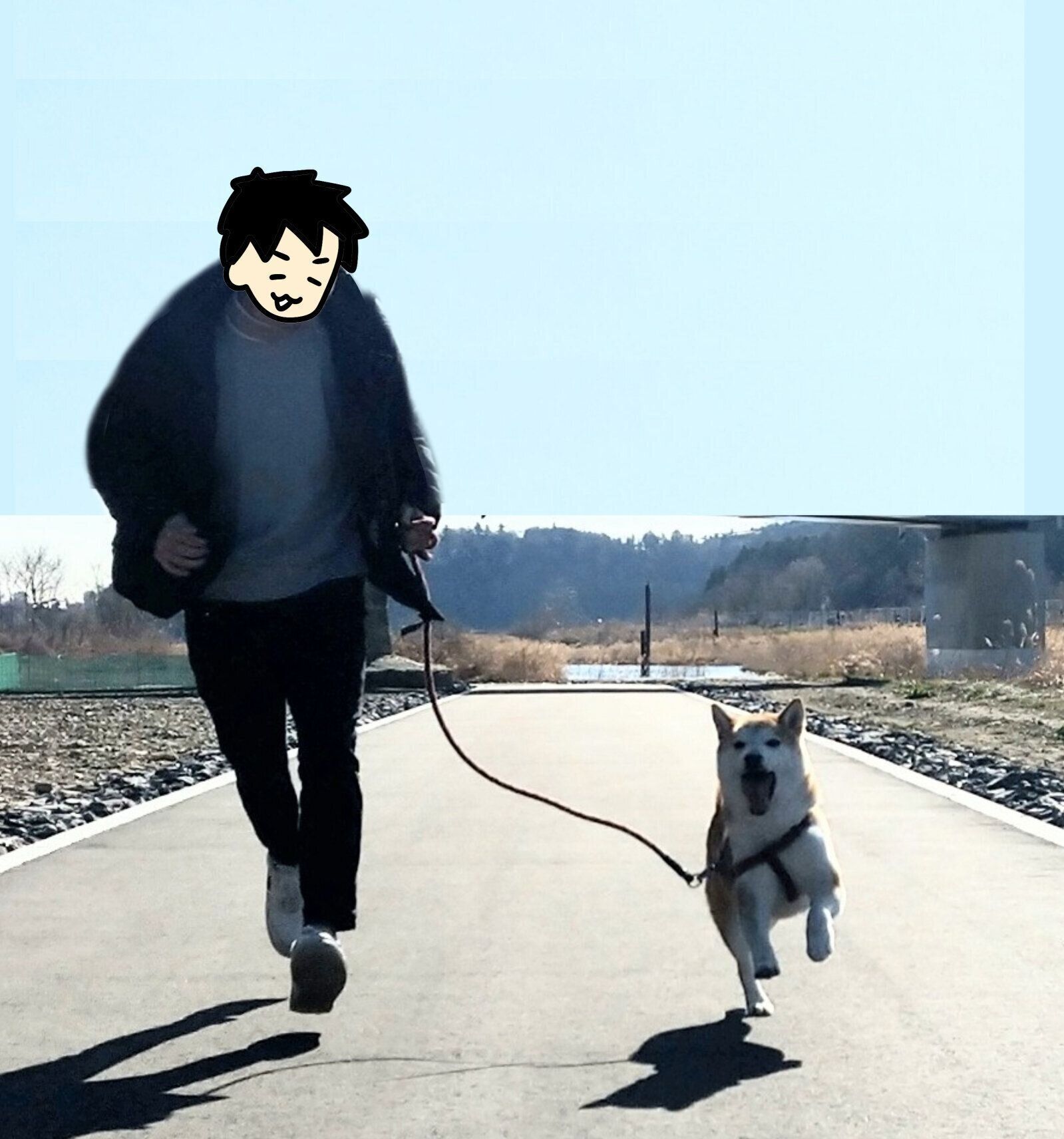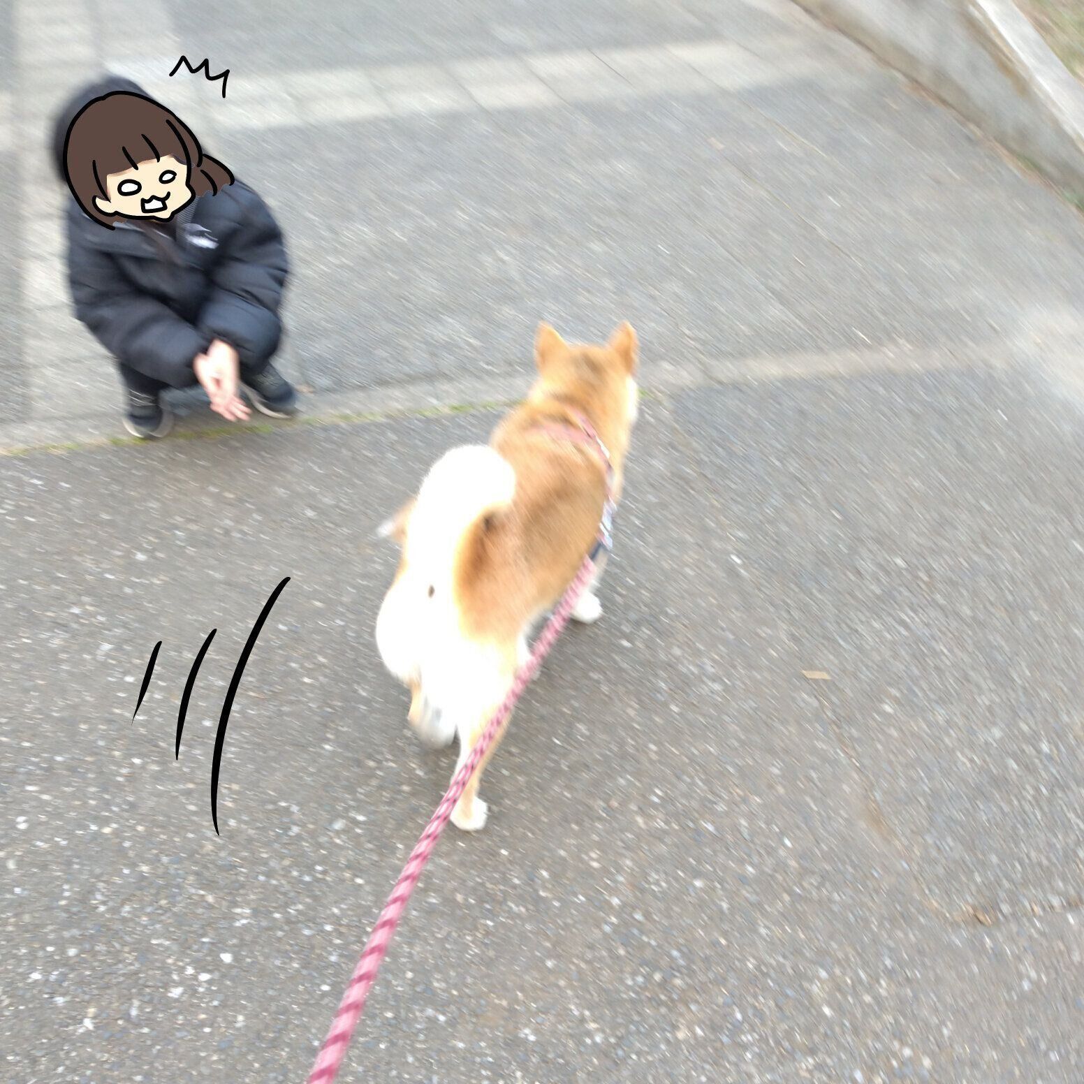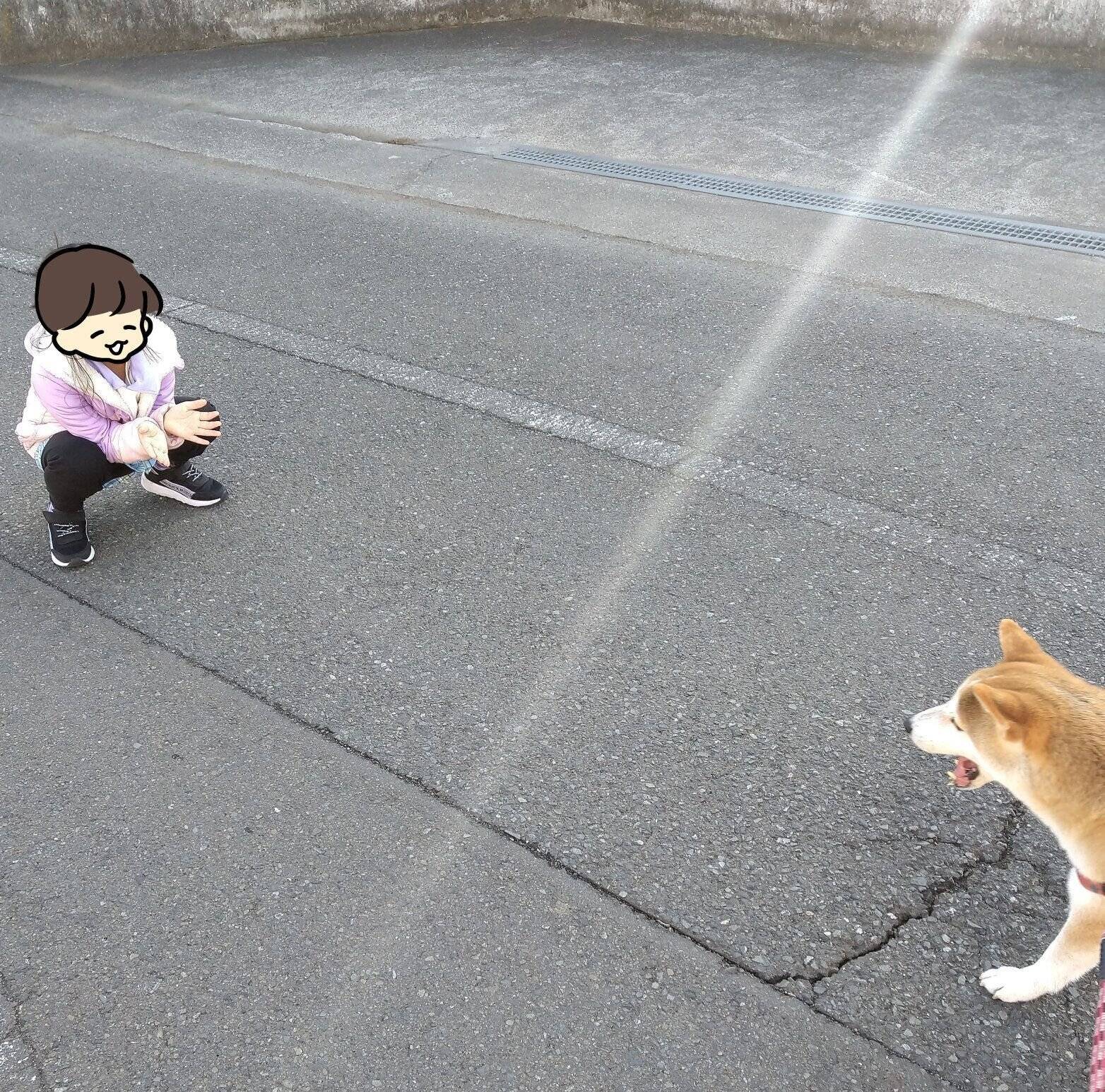 勢いよく娘の所へ行けば、そのまま立ち止まらず最後まで近くに来てくれるはず!広い場所へ行き、タロさんとパパが走って娘の所へ勢いよく走ってみることにしました。