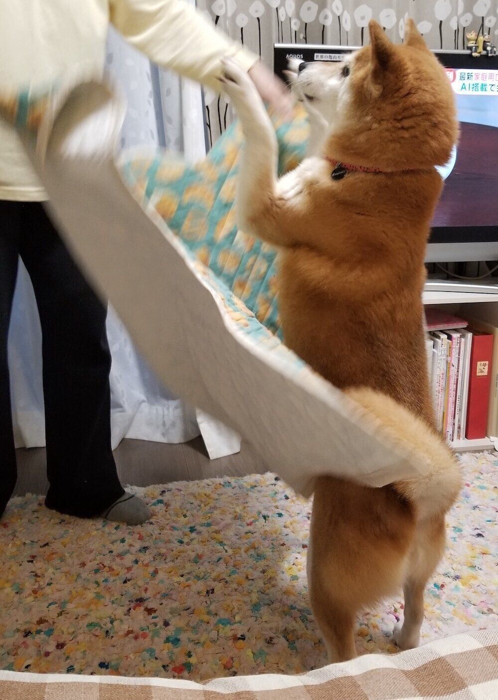 早く敷いてほしくて待ちきれず、いつもこうして立ち上がってしまうのです。