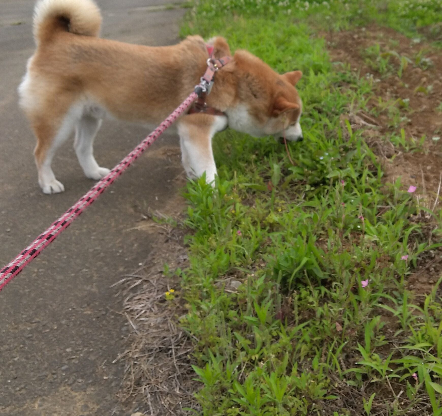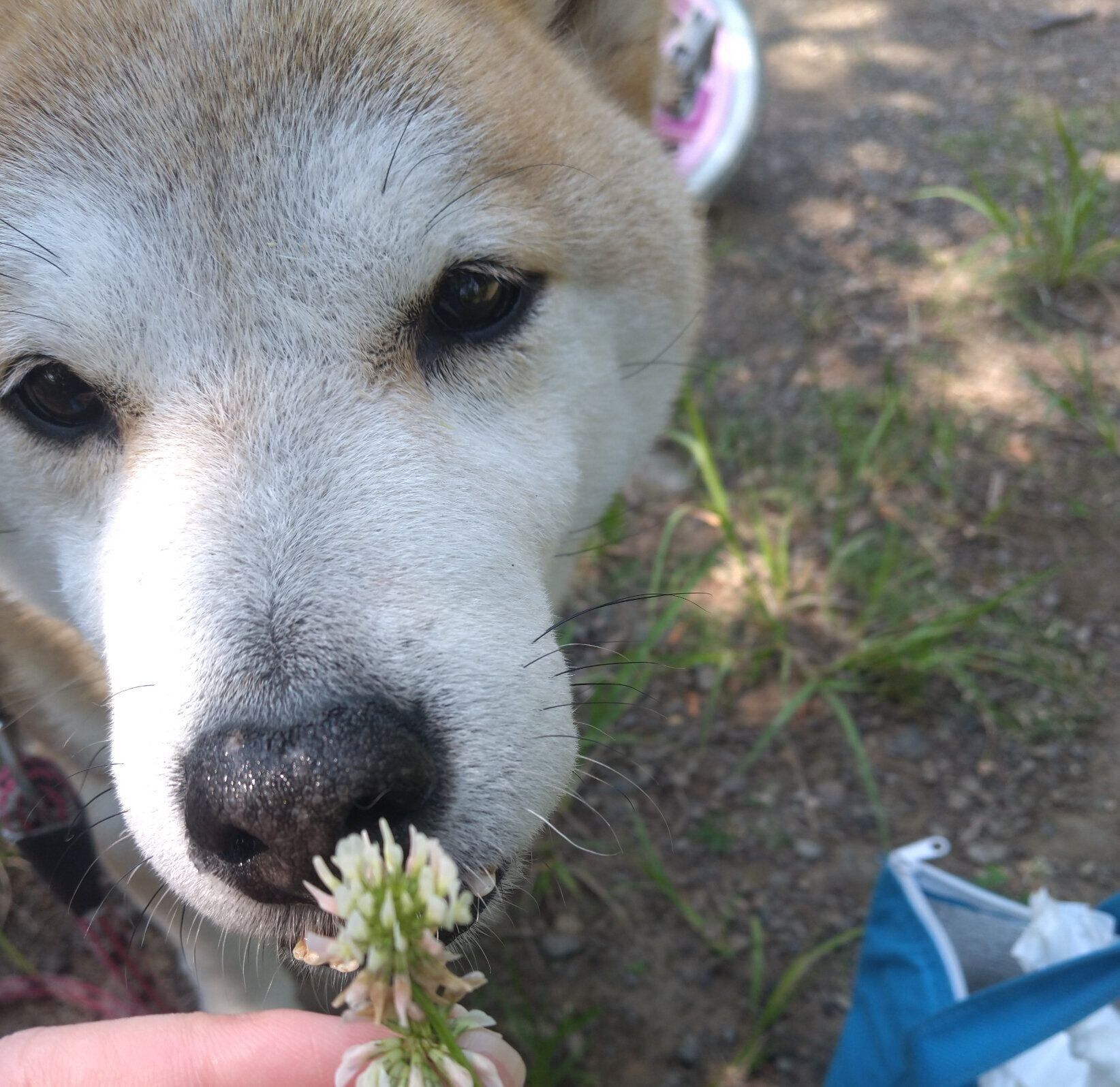 何気なく1本摘んでみると、タロさんが興味深々でシロツメクサを見つめ始めました。