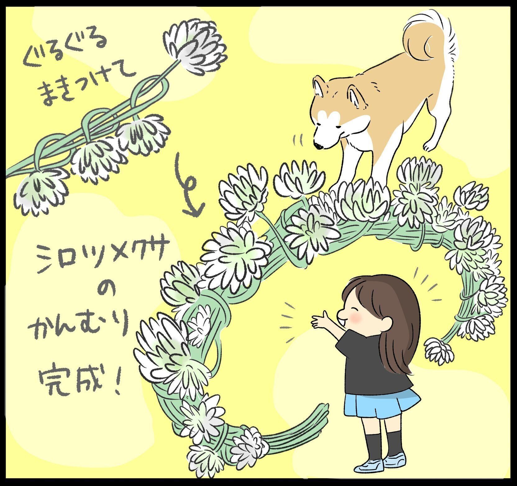 娘はタロさんにプレゼントするために人生初のシロツメクサの冠を作ります。