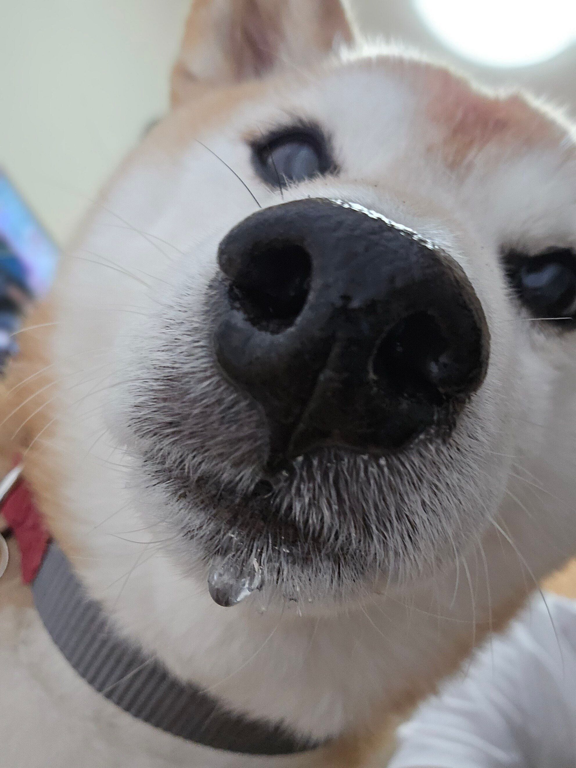 あごの下に水滴が付いていることを本犬は知らないんでしょうね。