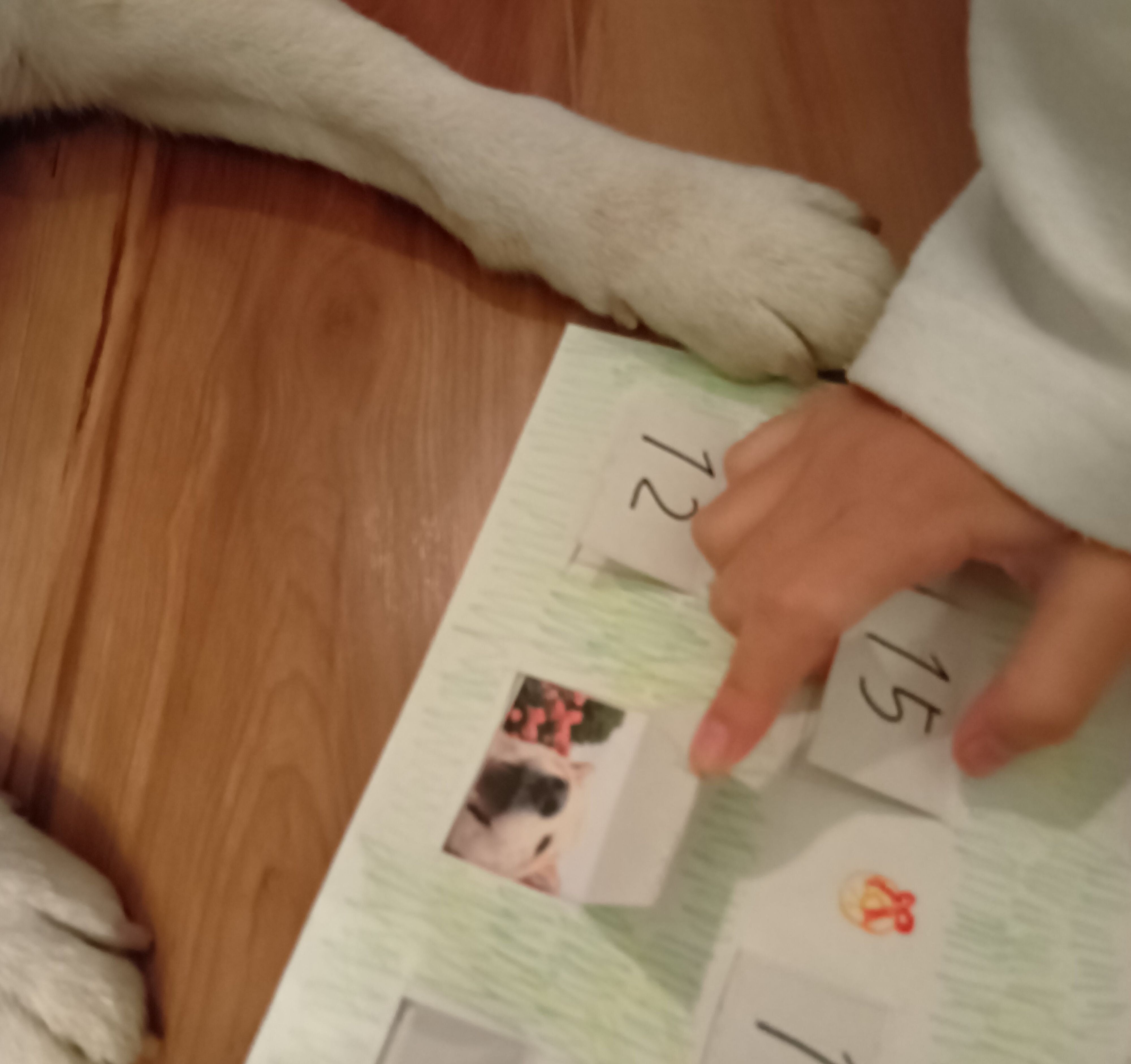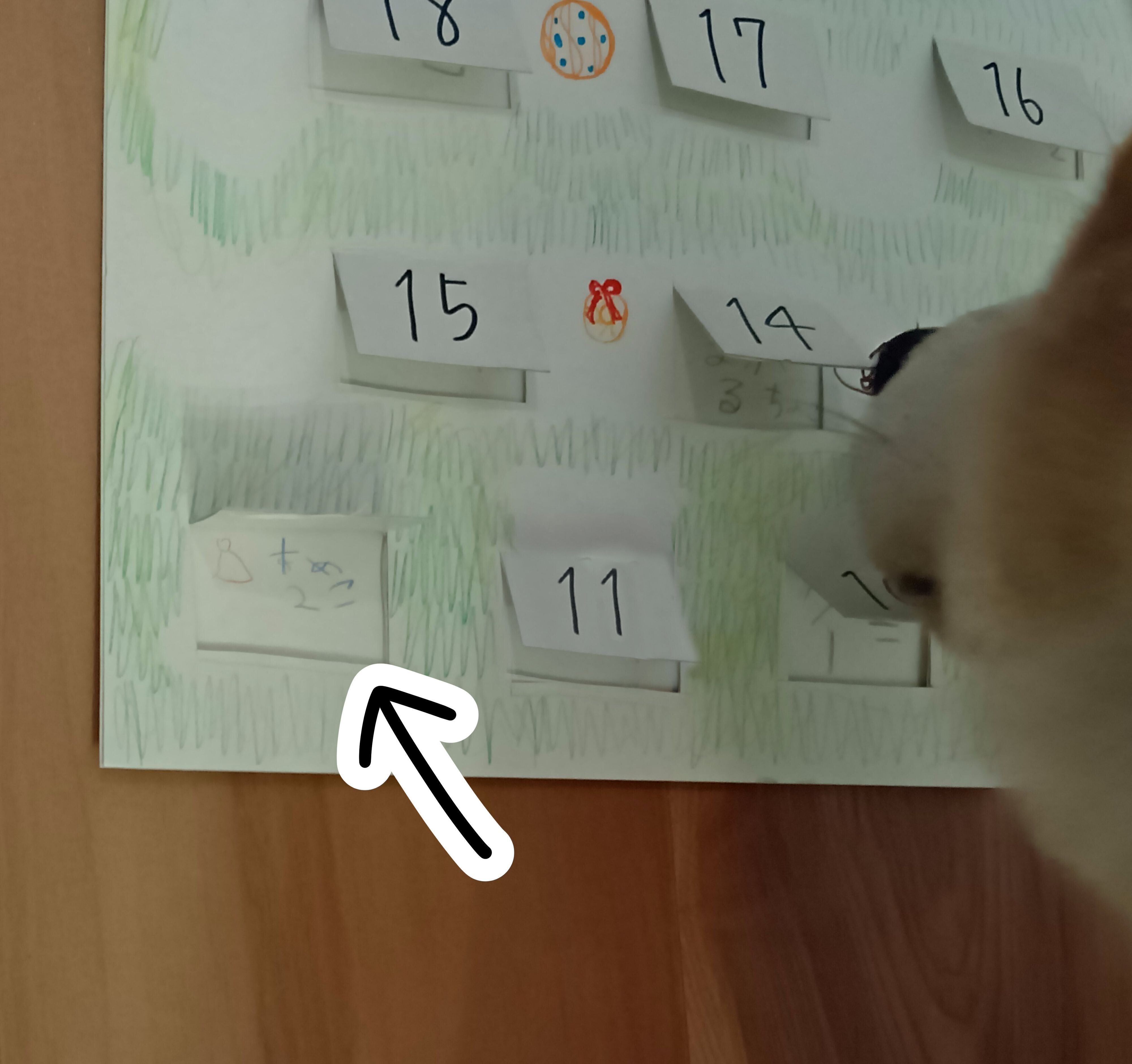 これでさらに楽しいカレンダーになった!と思ったのですが、この特別演出をみて「これはお菓子もらえるの?」と指摘する娘。