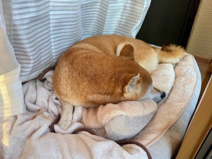 帰宅後、マロたんはすぐにお気に入りのふかふかベッドで眠りにつきました。久しぶりの遠出に加え、年齢的なものもあるのでしょう。ばんごはんの時間が近づいていましたが、無理に起こさずそっと見守ることに。