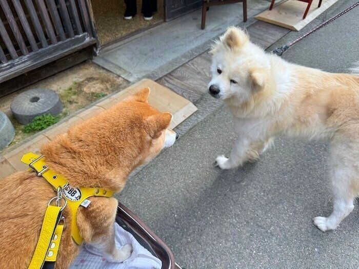 地元のわんことの出会いもありました。超キュートで穏やかな秋田犬ちゃんに、マロたんもしっぽをふりふり。秋田犬ちゃんも大きなしっぽを振り返してくれて、なごやかな光景に癒されました。