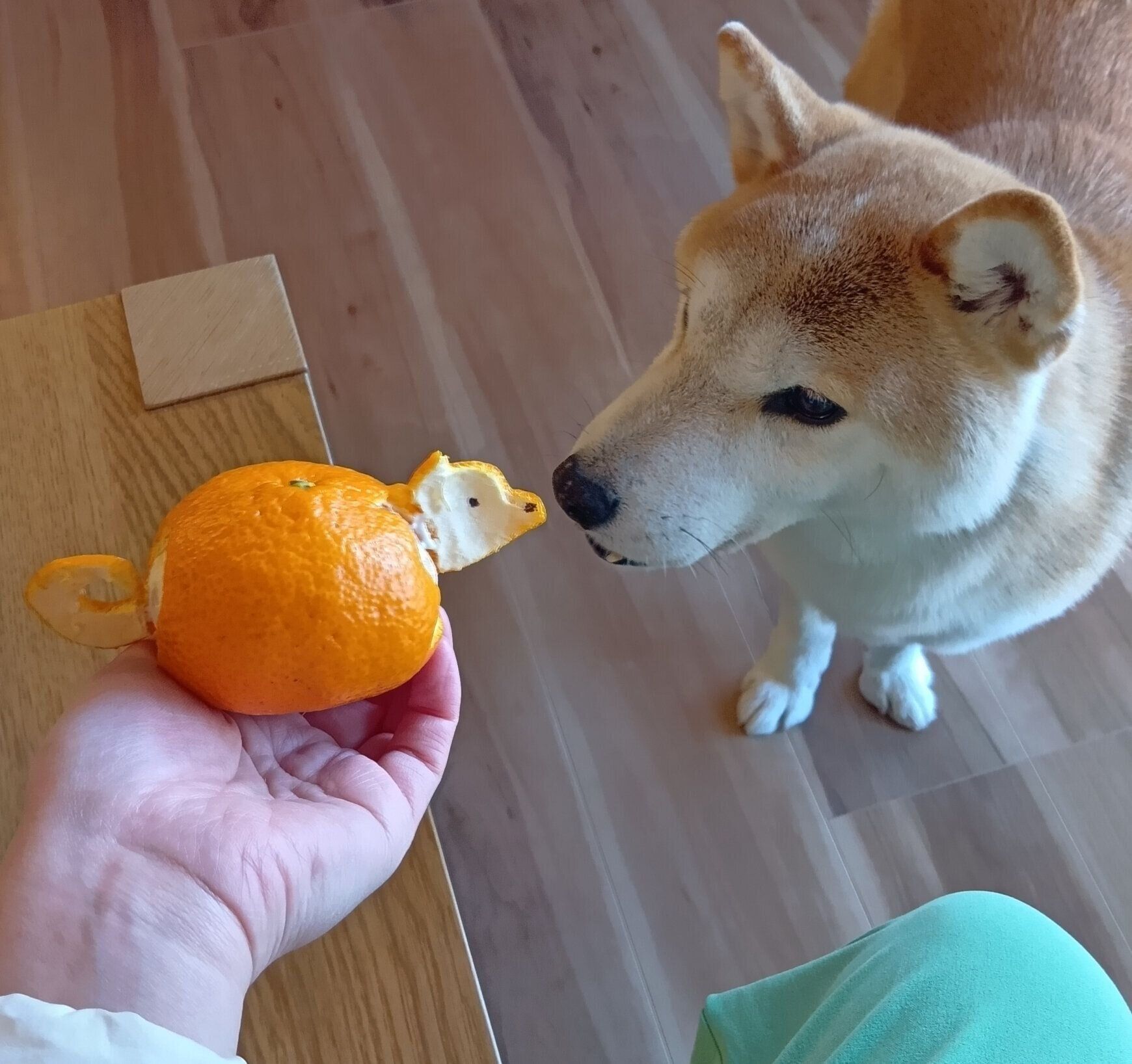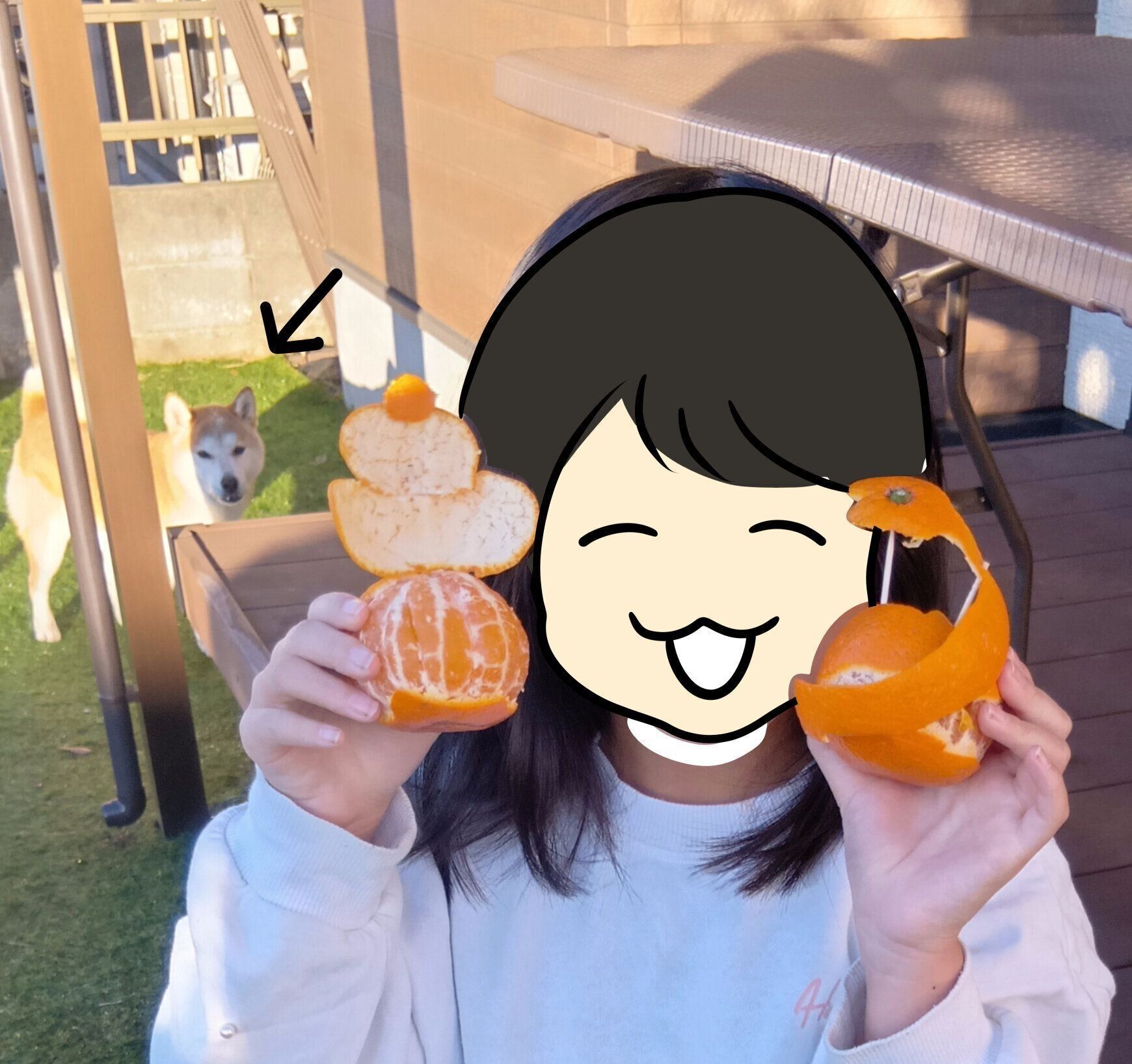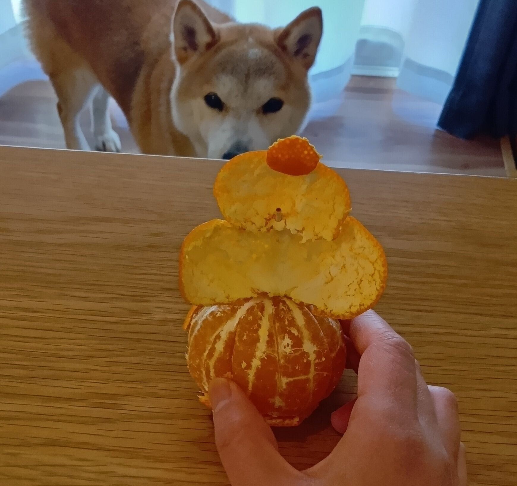 娘が「巳」と「鏡餅」のみかんを持って、タロさんの横に並びます。こっちを向いてほしいのですが、タロさんはみかんの匂いが気になるようです。