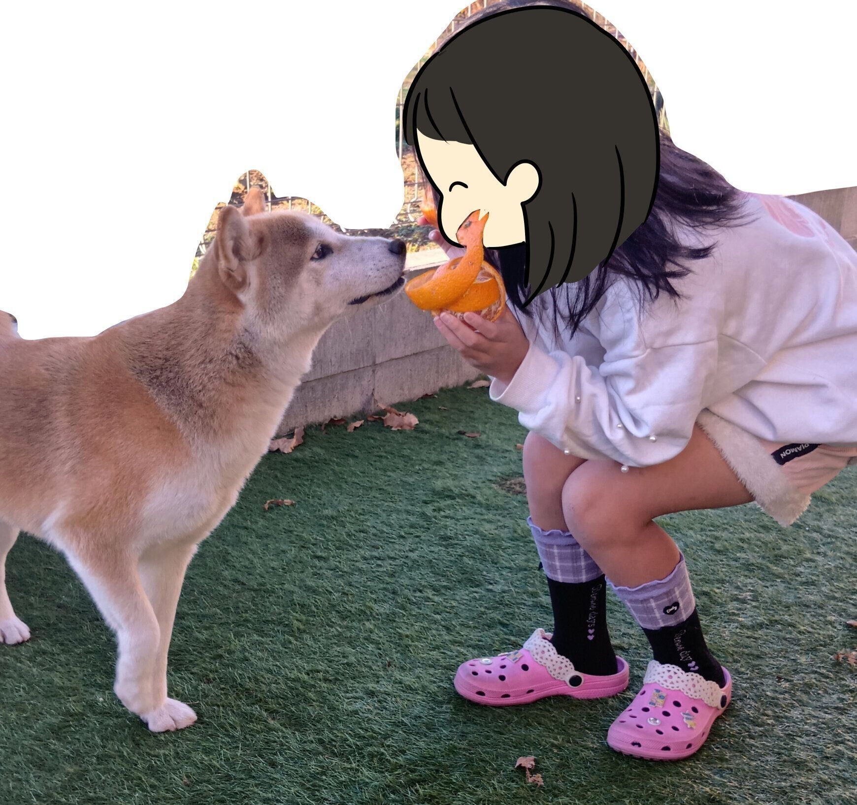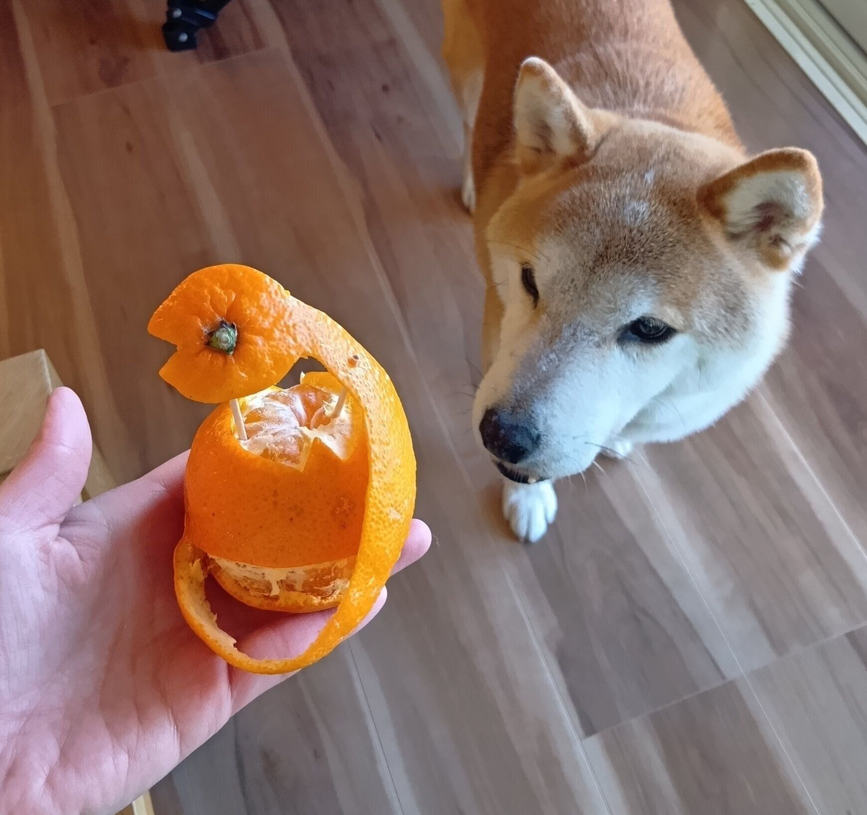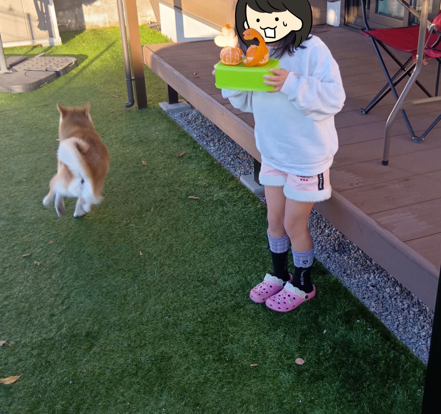 娘が「巳」と「鏡餅」のみかんを持って、タロさんの横に並びます。こっちを向いてほしいのですが、タロさんはみかんの匂いが気になるようです。