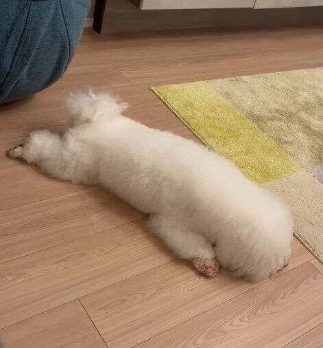 この日、大雨が降っていたので、めろちゃんに散歩中止を伝えたという飼い主さん。するとめろちゃんは、ふてくされたように床に伏せてしまったそうです。