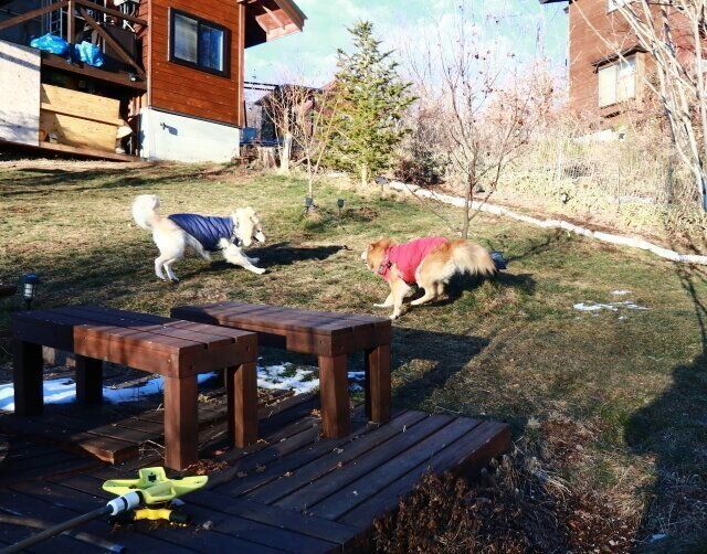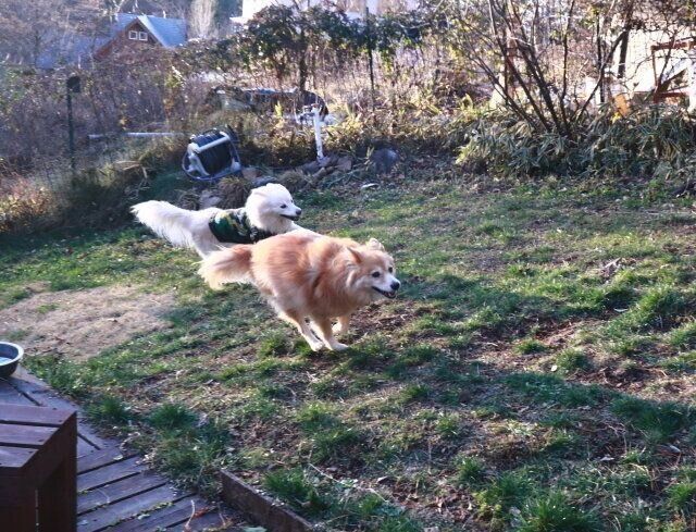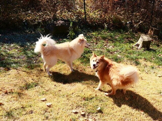 さらに、散歩から戻ると、毎回ドッグランで少しバトルしたり、走り回ったりする。私が頑張って草刈りした作った手作りドッグランだが、敷地が300坪あるので大福には十分の広さだ。