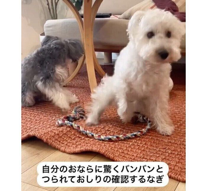 「なぎは音に驚いたのか地響きに驚いたのか、自分がおならをしたと思ったのか。それともバンデにつられただけなのかはわかりませんが、どんな気持ちでおしりを確認したのかは飼い主も謎です。なぎに聞いてみたいですね」
