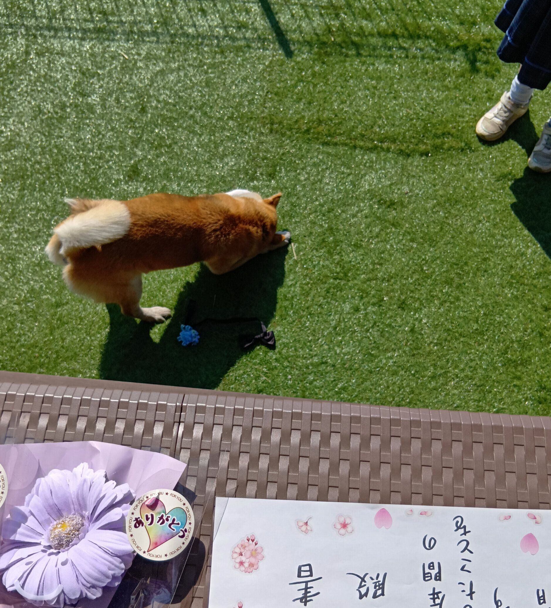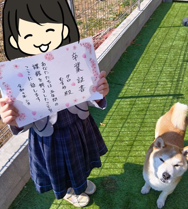 今まで毎日楽しく過ごせたことを証し、そしてこれからも元気に毎日過ごしていきましょう!と言葉をかけたかったのですが…タロさんが正装のリボンを振りほどいてしまったので、言葉は省略!早めに卒業証書を渡します。