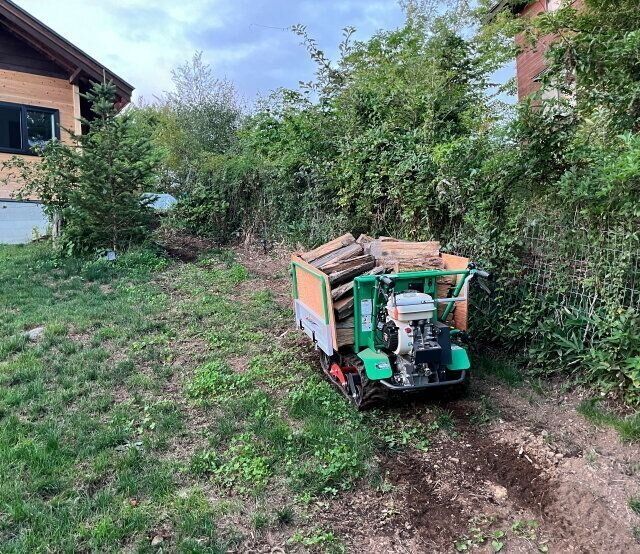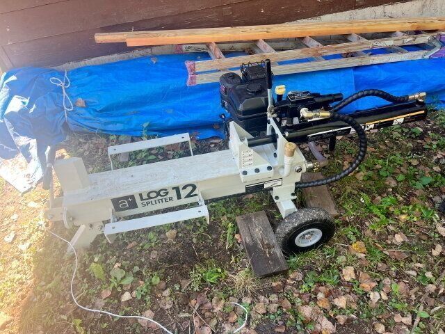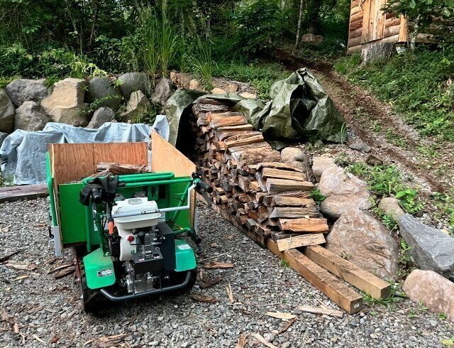 次に、わが家は坂を登ったところが家なので、そこまで運搬機で運ぶ。運んだら、今度は薪割り機で1つずつ割っていく。こんなの全部斧で割っていたら体を壊す(とアドバイスされた)から、こういう機械も必要になる。