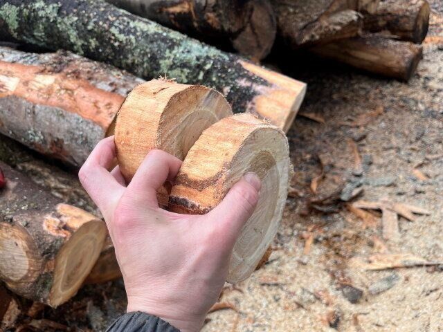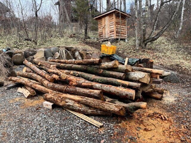 この間、伐採業者から原木を買った。以前、台風でドッグランの木が折れて屋根に刺さった際にお世話になった人で「原木が出たら言ってくださいね」と事前にお願いしてあったのだ。「広葉樹の原木出たけど、いる?」と電話があり、「お願いします」というと、家の前にトラックが横付けされて、ドドドと降ろされた。