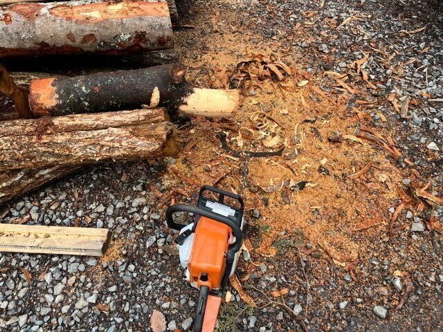 ここからが大変なのである。駐車場に降ろされた原木を、まず薪ストーブに入る40センチくらいに玉切り(伐採した木の枝などを払って、用途に応じて一定の長さに切り分ける作業)しなくてはならない。それにはチェーンソーを使うが、それも買ってある。