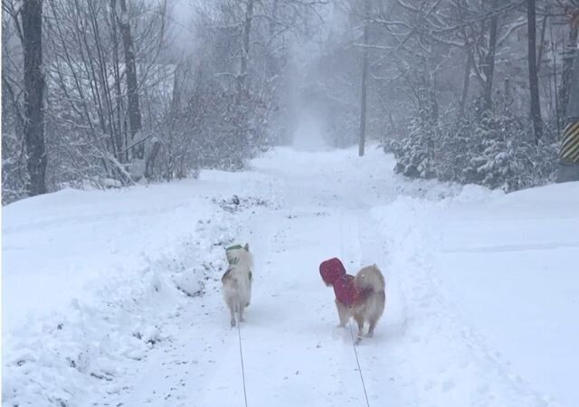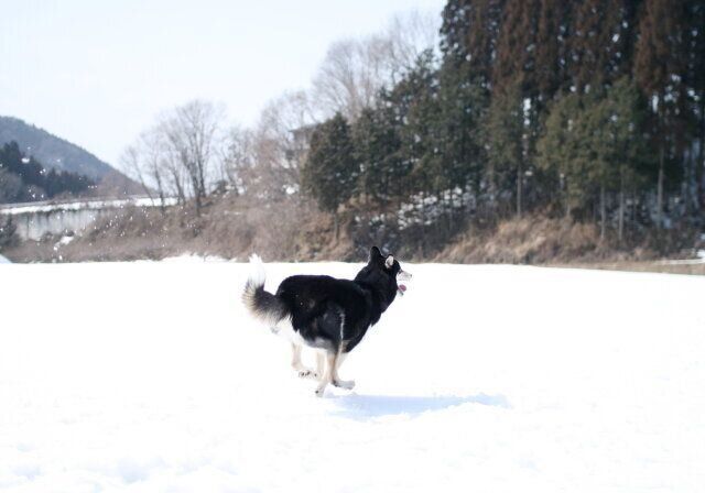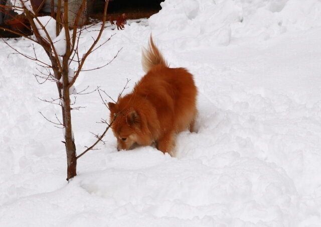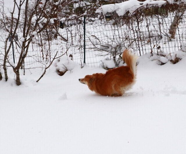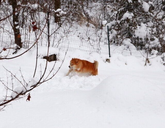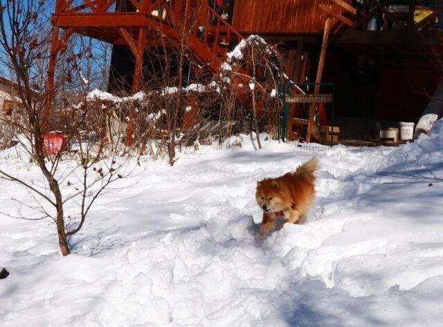 ところが翌々日、また雪が降り、今シーズン1番の積雪量を更新した。40センチ近く積もったから、このあたりではマックスレベルだ。その日も、雪が止んだタイミングを見計らって大福をドッグランに放った。