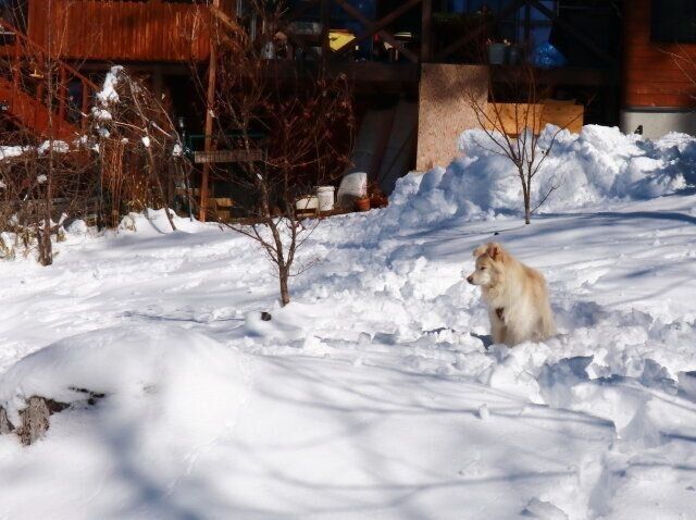 スイッチが入るのは、雪が止んで晴れないといけない。大福の雪遊びには天候状態が重要なのだ。だから私は仕事部屋の窓から、外の様子をちらちら見ていた。午後から雨の予報だったので、雪がそのまま雨に変わったら台無しである。びちゃびちゃに解けた雪でも大福は遊ばないからだ。