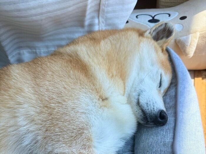 保護犬として迎えた当初は遠慮がちだったみつ子ちゃん。3年を経て、今ではベッドの真ん中で堂々と眠るように。少しずつ心を開いていった姿に、家族の愛情があふれます。