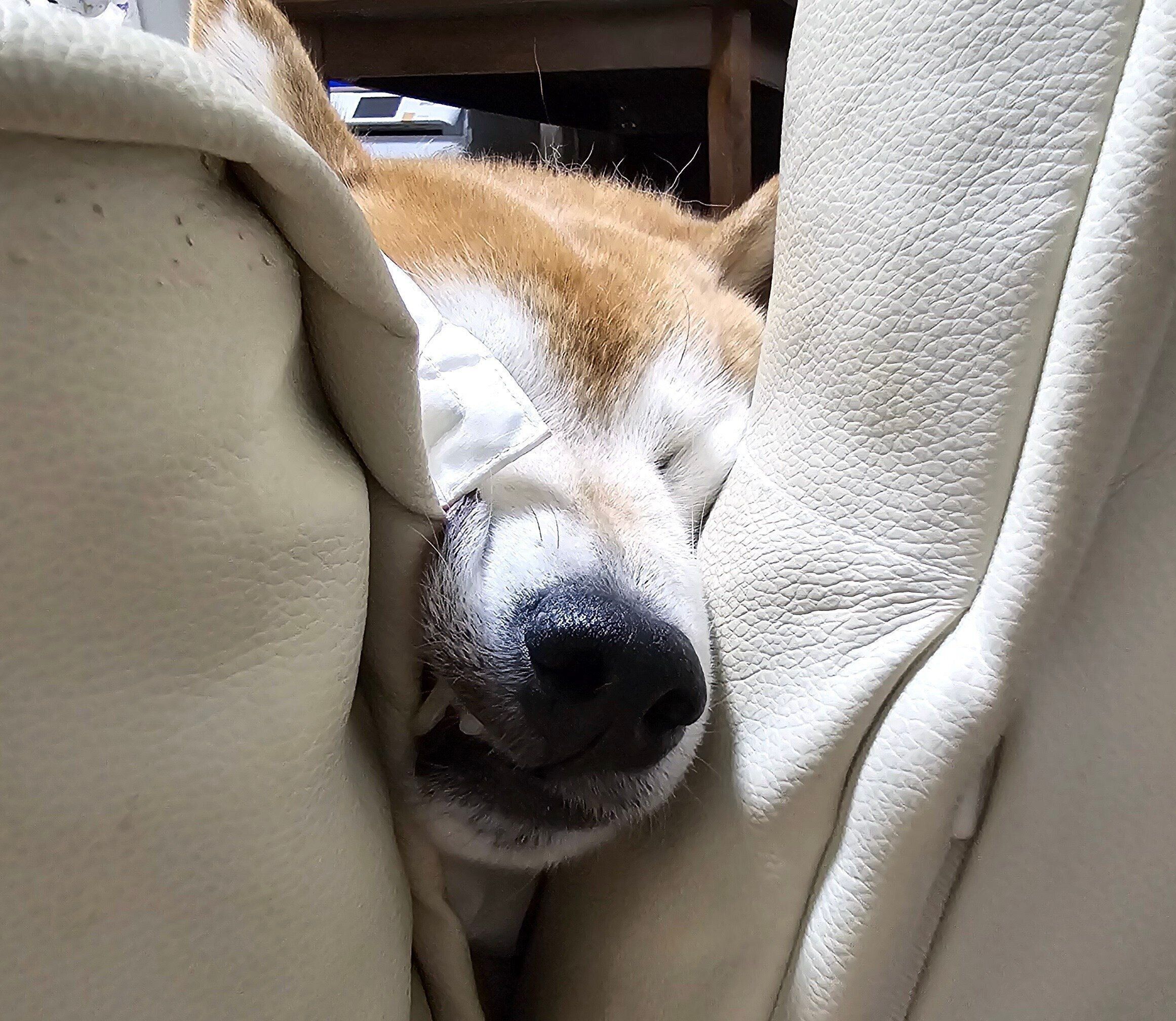 顔を隠しているのに分厚すぎる三角のお耳が目立って、すぐに柴犬だとバレてしまうとこ。