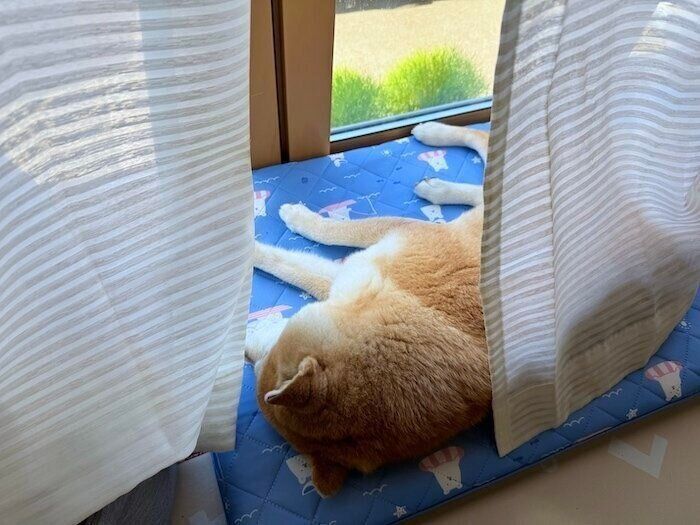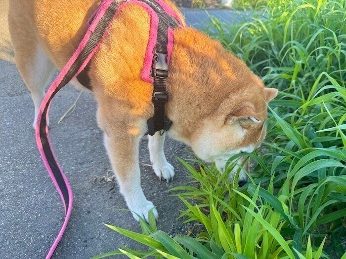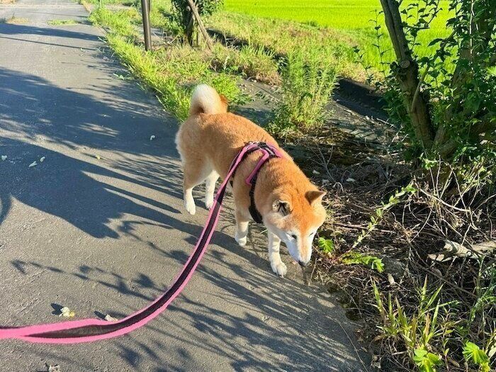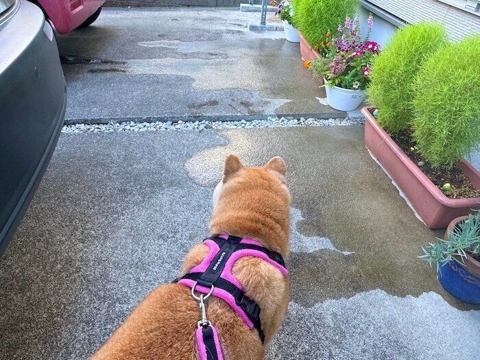 起きてしまえば「はいはい、お散歩ね」とドアの前の待ち、ぼんやりしながらポテポテとお散歩に出かけます。涼しいうちにさっさとお散歩を済ませて家に帰りましょう。この暑さの中で無理に散歩を頑張る必要はありません。