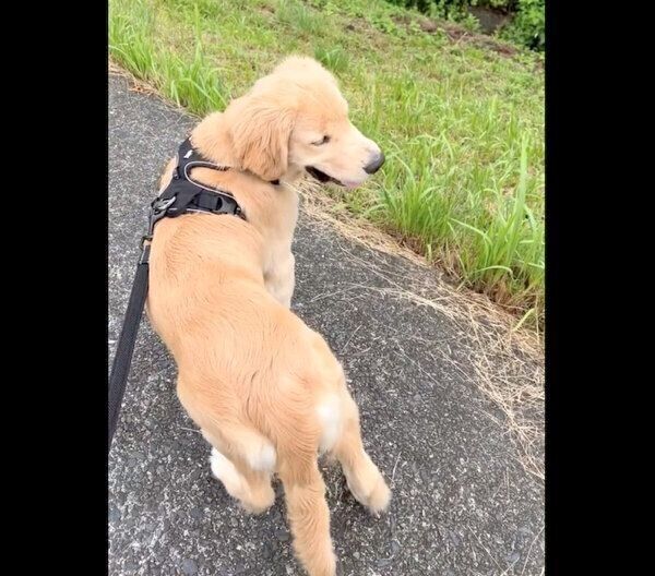 撮影時はポチタくんをお迎えした翌日で、近所を散歩していたときの様子だそう。外の世界に興味津々な様子が愛らしいですね。