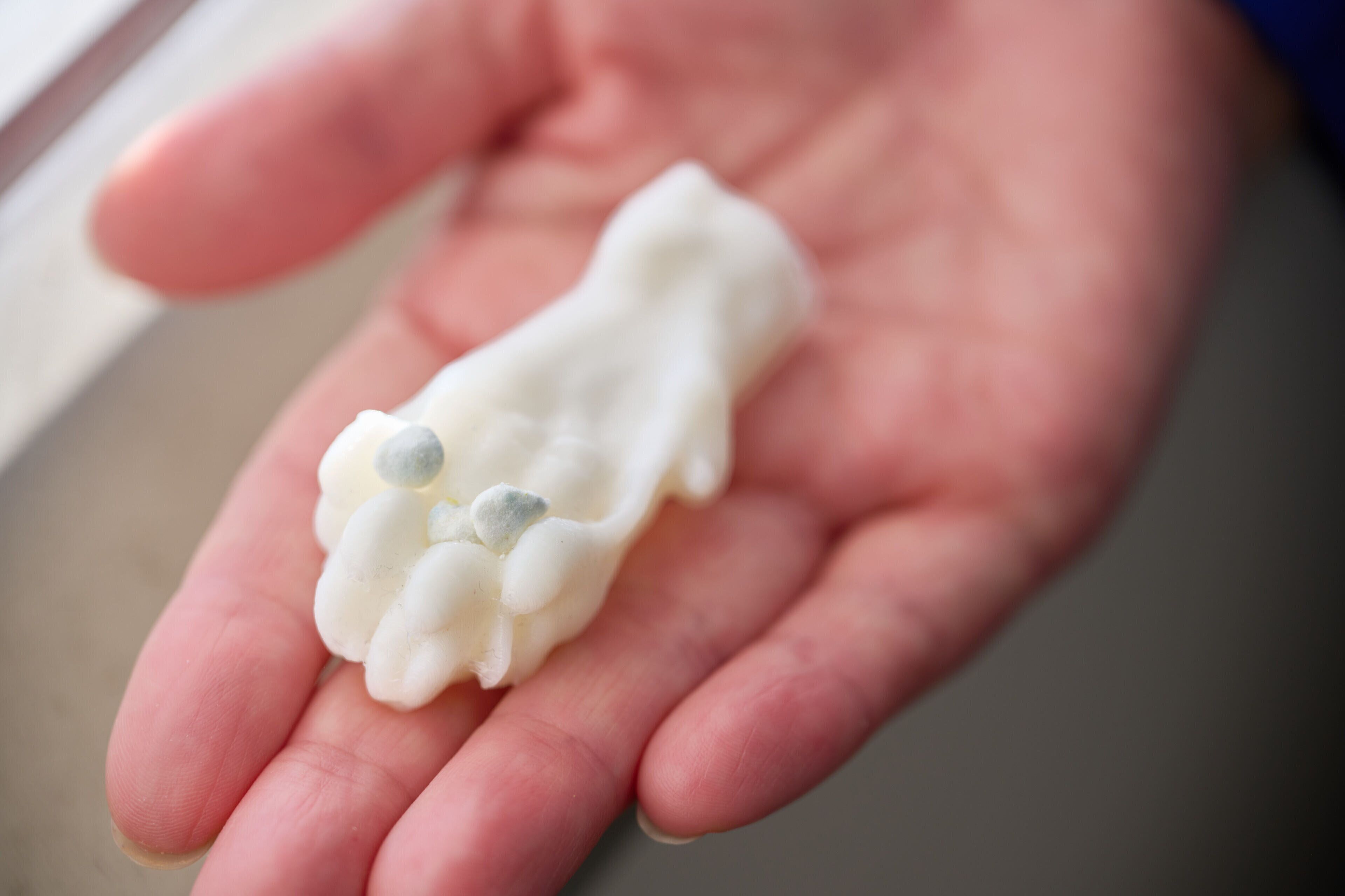 柿崎先生「私のほうでは猫の肉球をスキャンし、3Dプリンタで立体模型を作成しています。砂をどうかいているかを再現してみたり、やわらかい猫の足先の肉球部分の模型を作って、砂粒を実際に付着させ、どの粒径・形状が挟まりにくいか、といったことを検証しています」