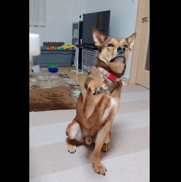 「遊ぶ人〜?」と声をかけると→前足を挙げて「はーい」とお返事!? 元保護犬の愛らしいしぐさに思わず笑顔に